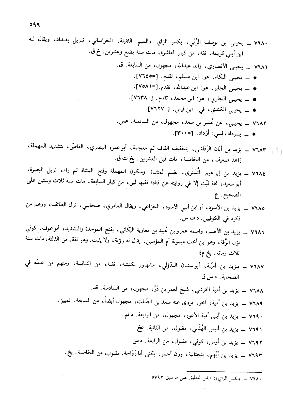 7684- يزيد ابن إبراهيم التستري بضم المثناة وسكون المهملة وفتح المثناة ثم راء نزيل البصرة أبو سعيد ثقة ثبت إلا في روايته عن قتادة ففيها لين من كبار السابعة مات سنة ثلاث وستين على الصحيح ع