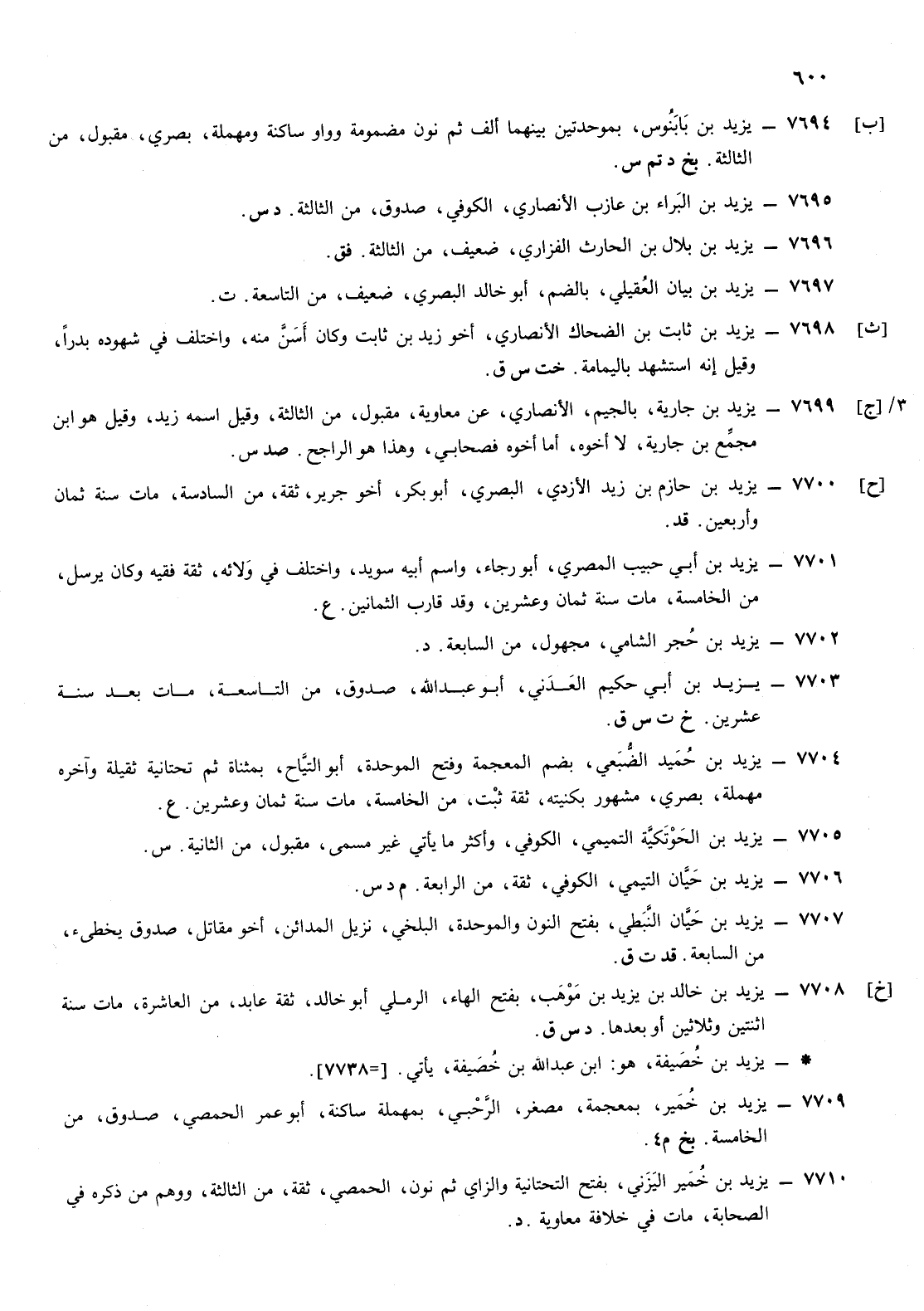 7704- يزيد ابن حميد الضبعي بضم المعجمة وفتح الموحدة أبو التياح بمثناة ثم تحتانية ثقيلة وآخره مهملة بصري مشهور بكنيته ثقة ثبت من الخامسة مات سنة ثمان وعشرين ع