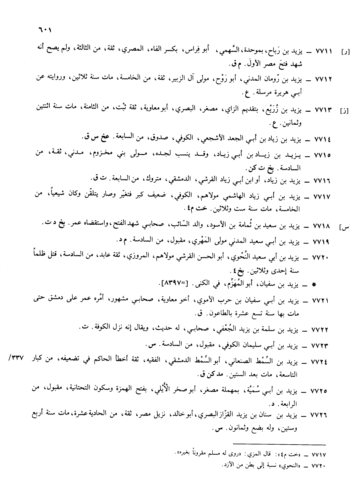 7712- يزيد ابن رومان المدني أبو روح مولى آل الزبير ثقة من الخامسة مات سنة ثلاثين وروايته عن أبي هريرة مرسلة ع