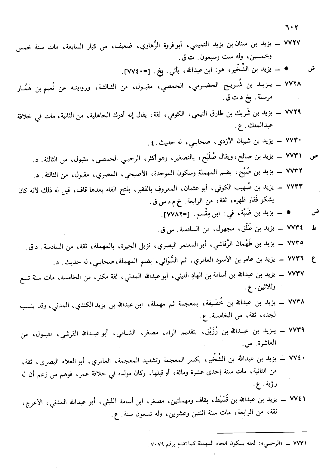 7737- يزيد ابن عبد الله ابن أسامة ابن الهاد الليثي أبو عبد الله المدني ثقة مكثر من الخامسة مات سنة تسع وثلاثين ع