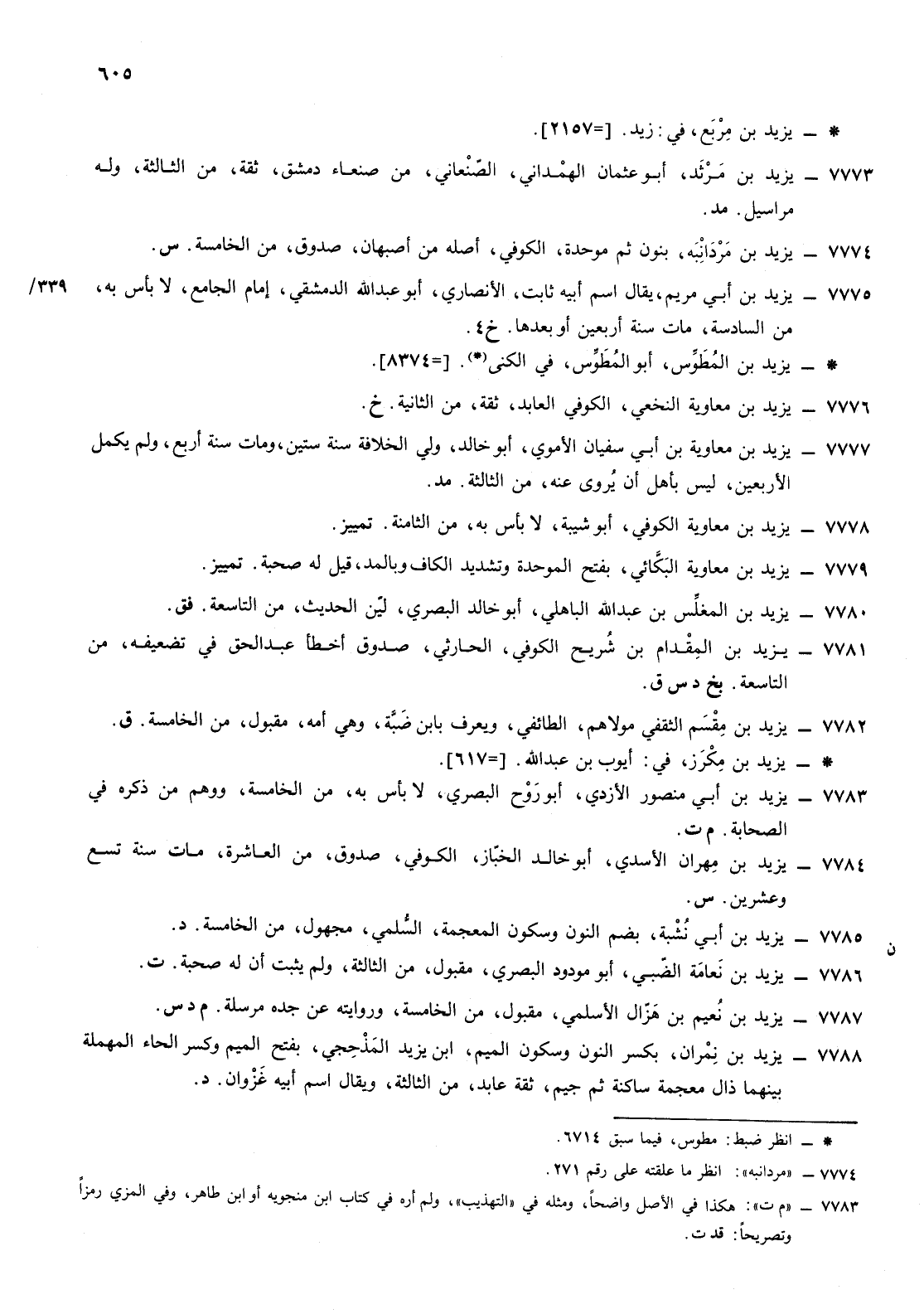 7782- يزيد ابن مقسم الثقفي مولاهم الطائفي ويعرف بابن ضبة وهي أمه مقبول من الخامسة ق [] يزيد ابن مكرز في أيوب ابن عبد الله [كذا قال، وليس له ذكر في ترجمة أيوب، ويزيد بن مكرز، من أهل الشام، مجهول، من الثالثة]