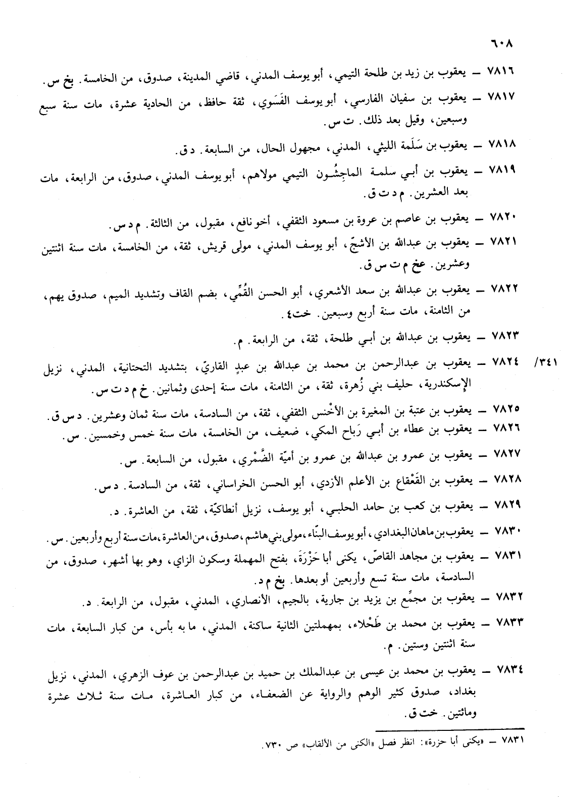 7817- يعقوب ابن سفيان الفارسي أبو يوسف الفسوي ثقة حافظ من الحادية عشرة مات سنة سبع وسبعين وقيل بعد ذلك ت س