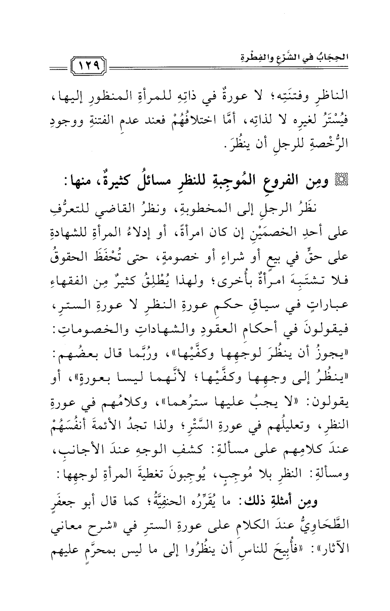 نظَرُ الرجلِ إلى المخطوبةِ، ونظرُ القاضي للتعرُّفِ على أحدِ الخصمَيْنِ إن كان امرأةً، أو إدلاءُ المرأةِ للشهادةِ على حقٍّ في بيعٍ أو شراءٍ أو خصومةٍ، حتى تُحْفَظَ الحقوقُ فلا تشتَبِهَ امرأةٌ بأُخرى؛ ولهذا يُطْلِقُ كثيرٌ مِن الفقهاءِ عباراتٍ في سياقِ حكمِ عورةِ النظرِ لا عورةِ السترِ، فيقولونَ في أحكامِ العقودِ والشهاداتِ والخصوماتِ: «يجوزُ أن ينظُرَ لوجهِها وكفَّيْها»، ورُبَّما قال بعضُهم: «ينظُرُ إلى وجهِها وكفَّيْها؛ لأنَّهما ليسا بعورةٍ»، أو يقولون: «لا يجبُ عليها سترُهما»، وكلامُهم في عورةِ النظرِ، وتعليلُهم في عورةِ السَّتْرِ؛ ولذا تجدُ الأئمةَ أنفُسَهُمْ عندَ كلامِهم على مسألةِ: كشفِ الوجهِ عندَ الأجانبِ، ومسألةِ: النظرِ بلا مُوجِبٍ، يُوجِبونَ تغطيةَ المرأةِ لوجهِها: