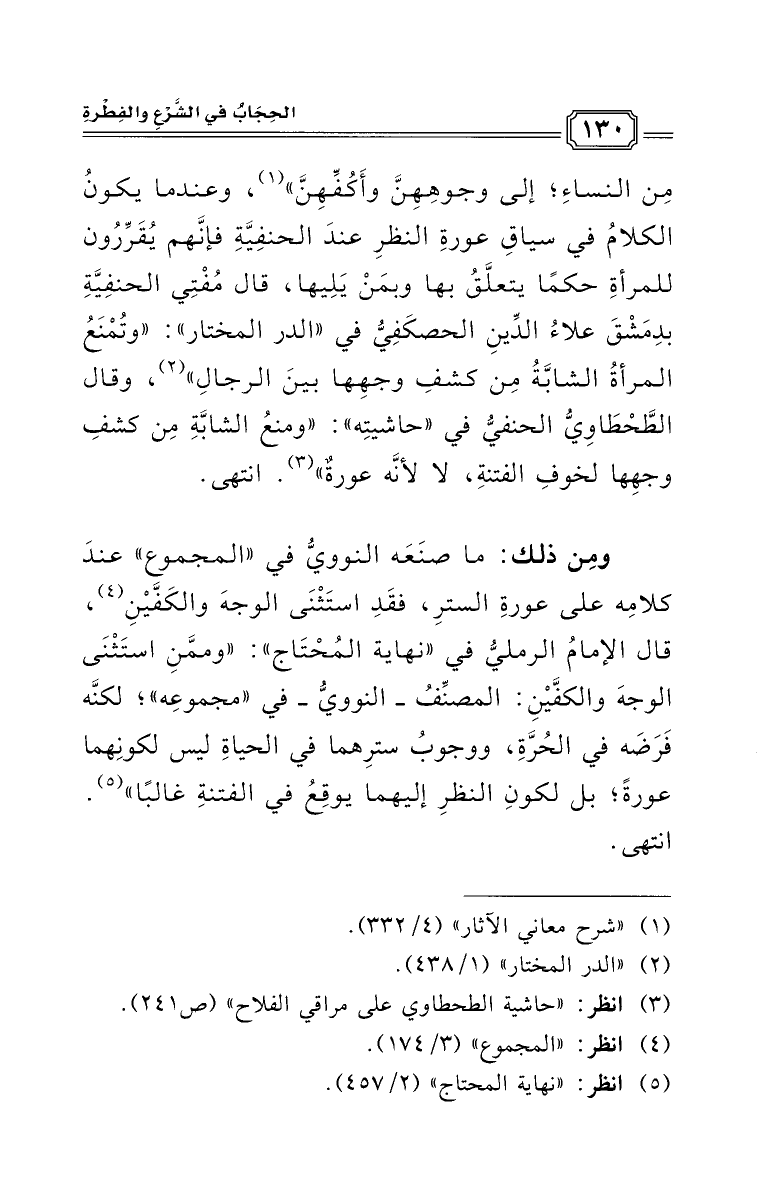 مِن النساءِ؛ إلى وجوهِهِنَّ وأَكُفِّهِنَّ» (¬1)، وعندما يكونُ الكلامُ في سياقِ عورةِ النظرِ عندَ الحنفِيَّةِ فإنَّهم يُقَرِّرُون للمرأةِ حكماً يتعلَّقُ بها وبمَنْ يَلِيها، قال مُفْتِي الحنفِيَّةِ بدِمَشْقَ علاءُ الدِّينِ الحصكَفِيُّ في «الدر المختار»: «وتُمْنَعُ المرأةُ الشابَّةُ مِن كشفِ وجهِها بينَ الرجالِ» (¬2)، وقال الطَّحْطَاوِيُّ الحنفيُّ في «حاشيتِه»: «ومنعُ الشابَّةِ مِن كشفِ وجهِها لخوفِ الفتنةِ، لا لأنَّه عورةٌ» (¬3). انتهى.