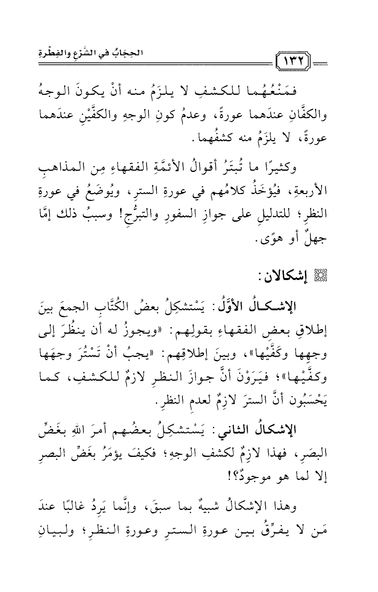 الإشكالُ الأوَّلُ: يَسْتشكِلُ بعضُ الكُتَّابِ الجمعَ بينَ إطلاقِ بعضِ الفقهاءِ بقولِهم: «ويجوزُ له أَن ينظُرَ إلى وجهِها وكَفَّيْها»، وبينَ إطلاقِهم: «يجبُ أنْ تَسْتُرَ وجهَها وكفَّيْها»؛ فيَرَوْنَ أنَّ جوازَ النظرِ لازمٌ للكشفِ، كما يَحْسَبُون أنَّ السترَ لازِمٌ لعدمِ النظرِ.