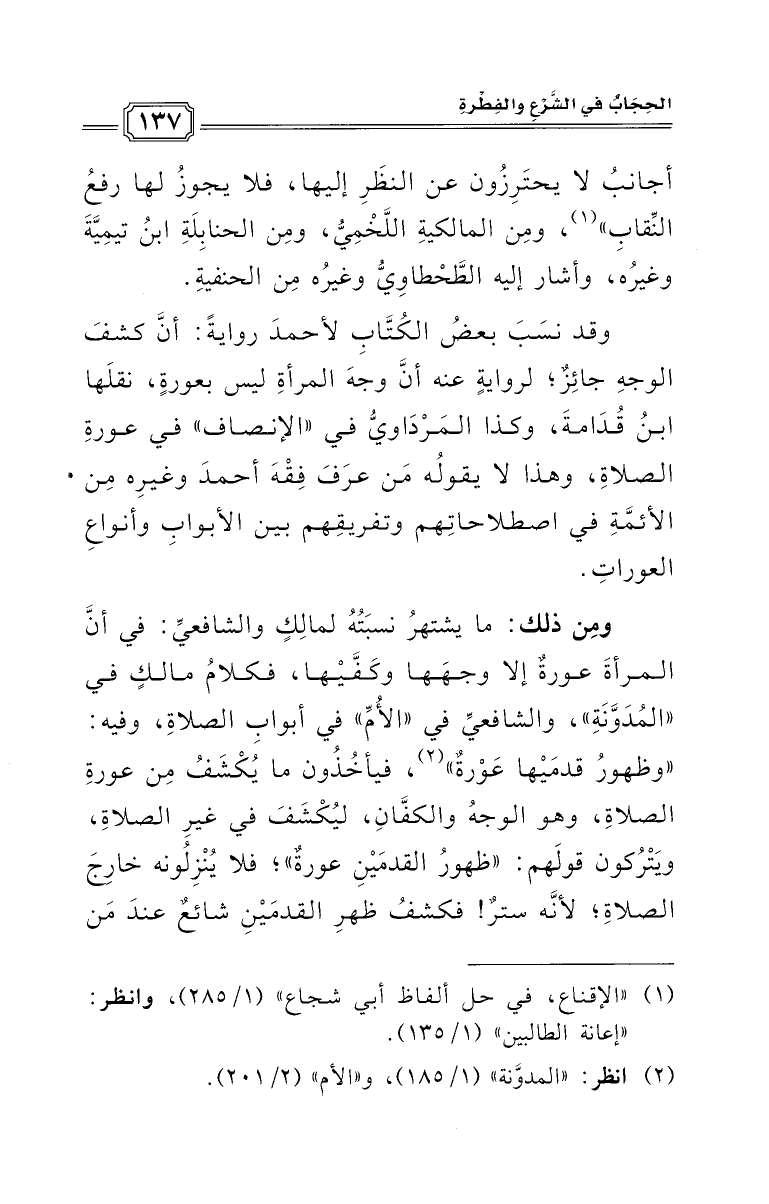 وقد نسَبَ بعضُ الكُتَّابِ لأحمدَ روايةً: أنَّ كشفَ الوجهِ جائِزٌ؛ لروايةٍ عنه أنَّ وجهَ المرأةِ ليس بعورةٍ، نقلَها ابنُ قُدَامةَ، وكذا المَرْدَاويُّ في «الإنصاف» في عورةِ الصلاةِ، وهذا لا يقولُه مَن عرَفَ فِقْهَ أحمدَ وغيرِه مِن الأئمَّةِ في اصطلاحاتِهم وتفريقِهم بين الأبوابِ وأنواعِ العوراتِ.