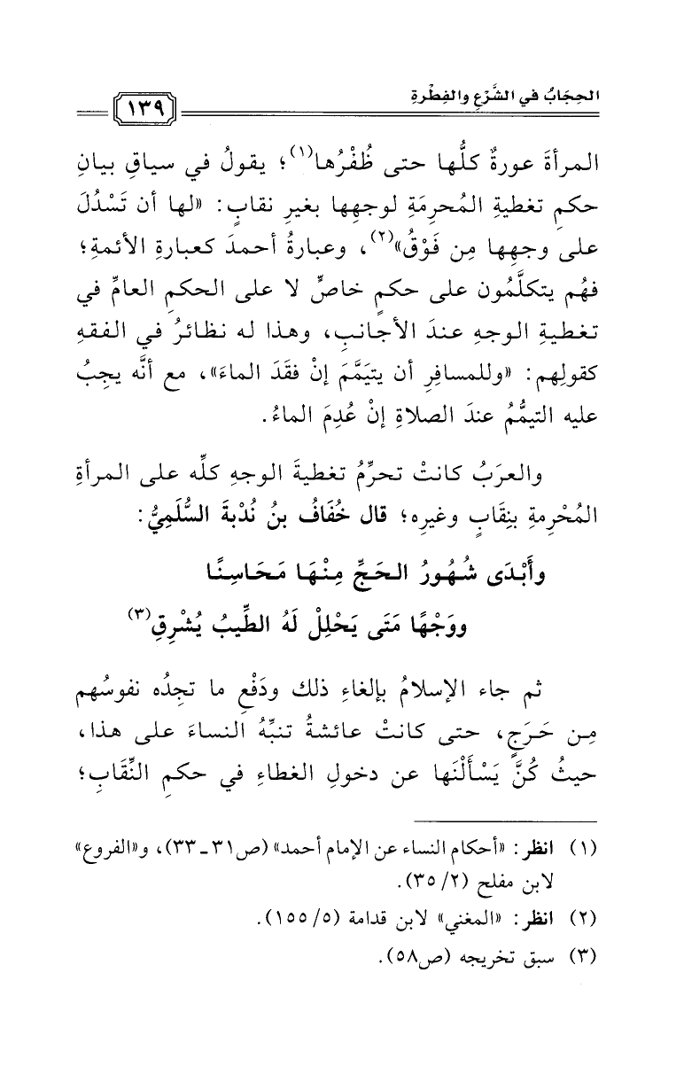 المرأةَ عورةٌ كلُّها حتى ظُفْرُها (¬1)؛ يقولُ في سياقِ بيانِ حكمِ تغطيةِ المُحرِمَةِ لوجهِها بغيرِ نقابٍ: «لها أن تَسْدُلَ على وجهِها مِن فَوْقُ» (¬2)، وعبارةُ أحمدَ كعبارةِ الأئمةِ؛ فهُم يتكلَّمُون على حكمٍ خاصٍّ لا على الحكمِ العامِّ في تغطيةِ الوجهِ عندَ الأجانبِ، وهذا له نظائرُ في الفقهِ كقولهم: «وللمسافِرِ أن يتيَمَّمَ إنْ فقَدَ الماءَ»، مع أنَّه يجِبُ عليه التيمُّمُ عندَ الصلاةِ إنْ عُدِمَ الماءُ.