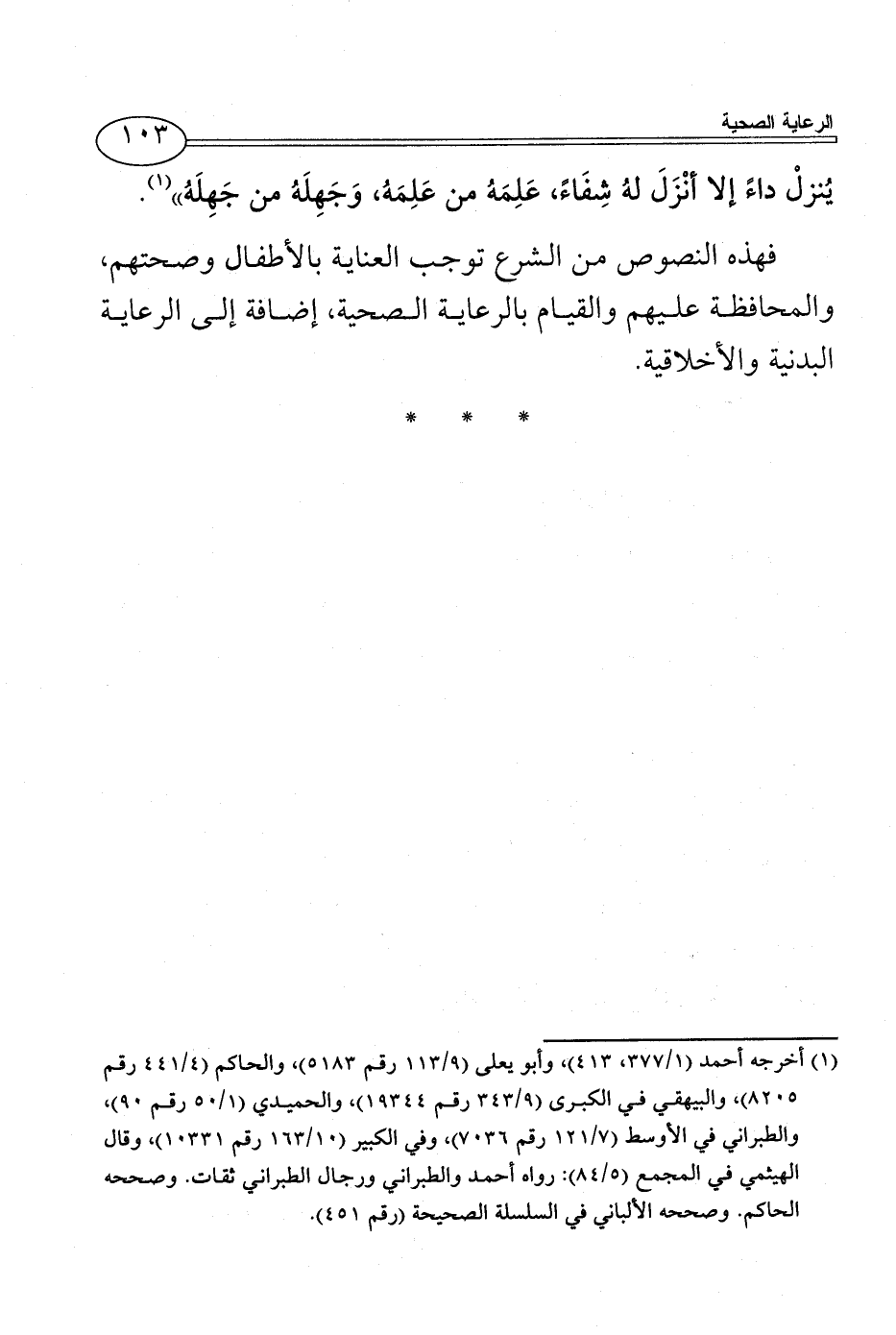 فهذه النصوص من الشرع توجب العناية بالأطفال وصحتهم، والمحافظة عليهم والقيام بالرعاية الصحية، إضافة إلى الرعاية البدنية والأخلاقية.