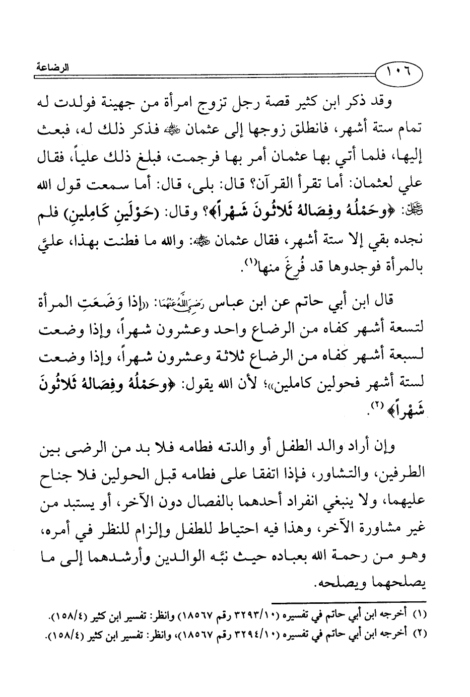 وقد ذكر ابن كثير قصة رجل تزوج امرأة من جهينة فولدت له تمام ستة أشهر، فانطلق زوجها إلى عثمان - رضي الله عنه - فذكر ذلك له، فبعث إليها، فلما أتي بها عثمان أمر بها فرجمت، فبلغ ذلك علياً، فقال علي لعثمان: أما تقرأ القرآن؟ قال: بلى، قال: أما سمعت قول الله - عز وجل -: {وحَمْلُهُ وفِصَالهُ ثَلاثُونَ شَهْراً}؟ وقال: (حَوْلَينِ كَامِلينِ) فلم نجده بقي إلا ستة أشهر، فقال عثمان - رضي الله عنه -: والله ما فطنت بهذا، عليَّ بالمرأة فوجدوها قد فُرِغَ منها (¬1).