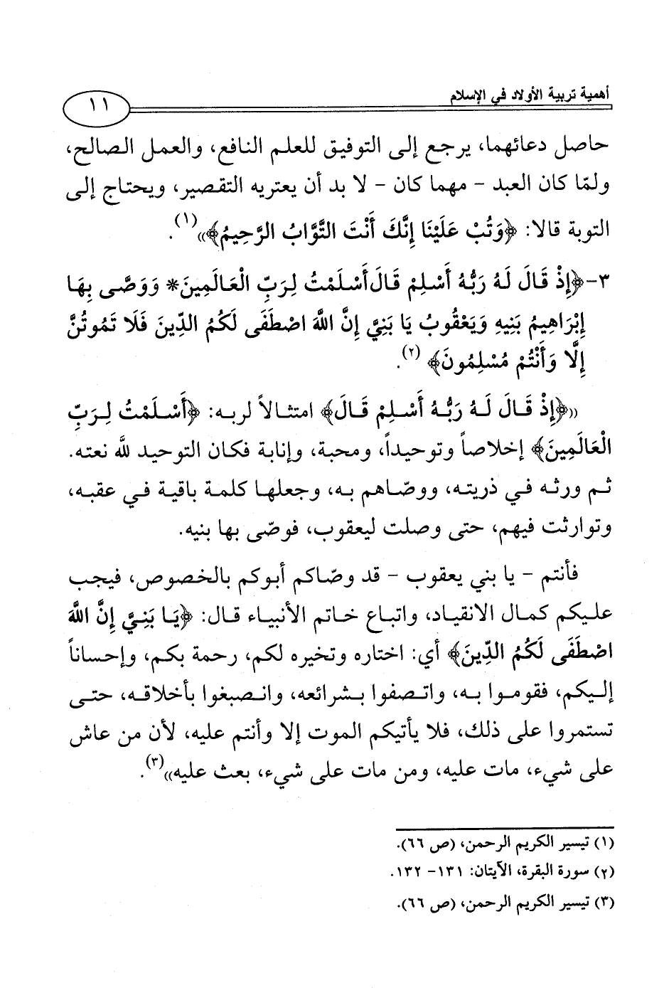 3 - (إِذْ قَالَ لَهُ رَبُّهُ أَسْلِمْ قَالَ أَسْلَمْتُ لِرَبِّ الْعَالَمِينَ* وَوَصَّى بِهَا إِبْرَاهِيمُ بَنِيهِ وَيَعْقُوبُ يَا بَنِيَّ إِنَّ اللَّهَ اصْطَفَى لَكُمُ الدِّينَ فَلَا تَمُوتُنَّ إِلَّا وَأَنْتُمْ مُسْلِمُونَ) (¬2).