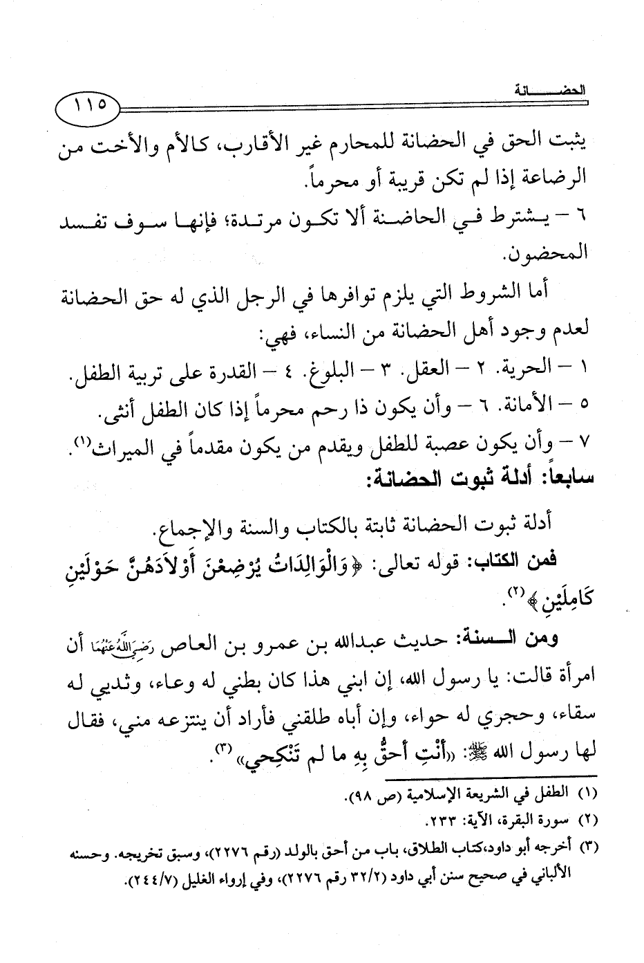 ومن السنة: حديث عبد الله بن عمرو بن العاص رَضِيَ اللَّهُ عَنْهُمَا أن امرأة قالت: يا رسول الله، إن ابني هذا كان بطني له وعاء، وثديي له سقاء، وحجري له حواء، وإن أباه طلقني فأراد أن ينتزعه مني، فقال لها رسول الله - صلى الله عليه وسلم -: ((أنْتِ أحقُّ بِهِ ما لم تَنْكِحي)) (¬3).