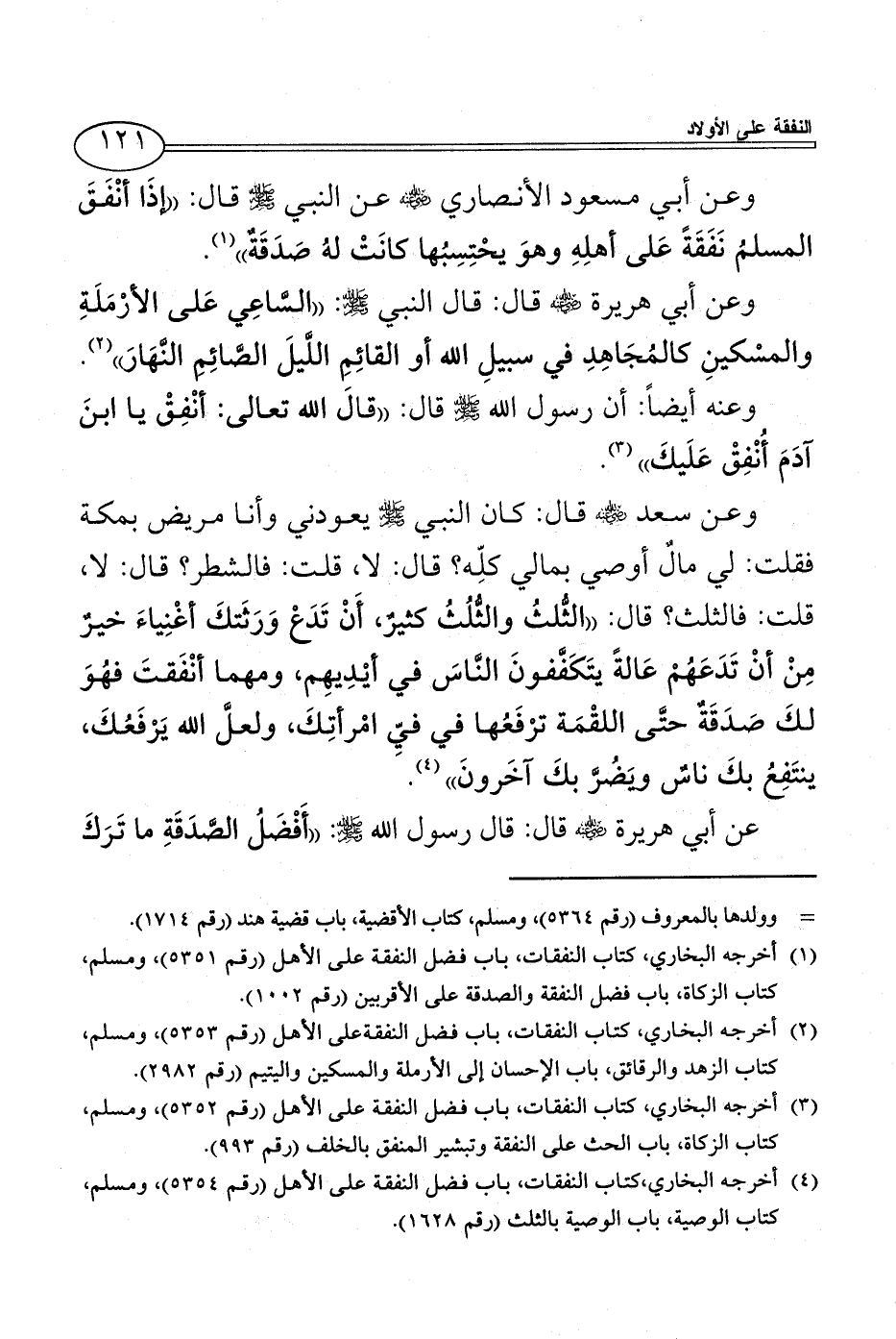 (¬4) أخرجه البخاري، كتاب النفقات، باب فضل النفقة على الأهل (رقم 5354)، ومسلم، كتاب الوصية، باب الوصية بالثلث (رقم 1628).