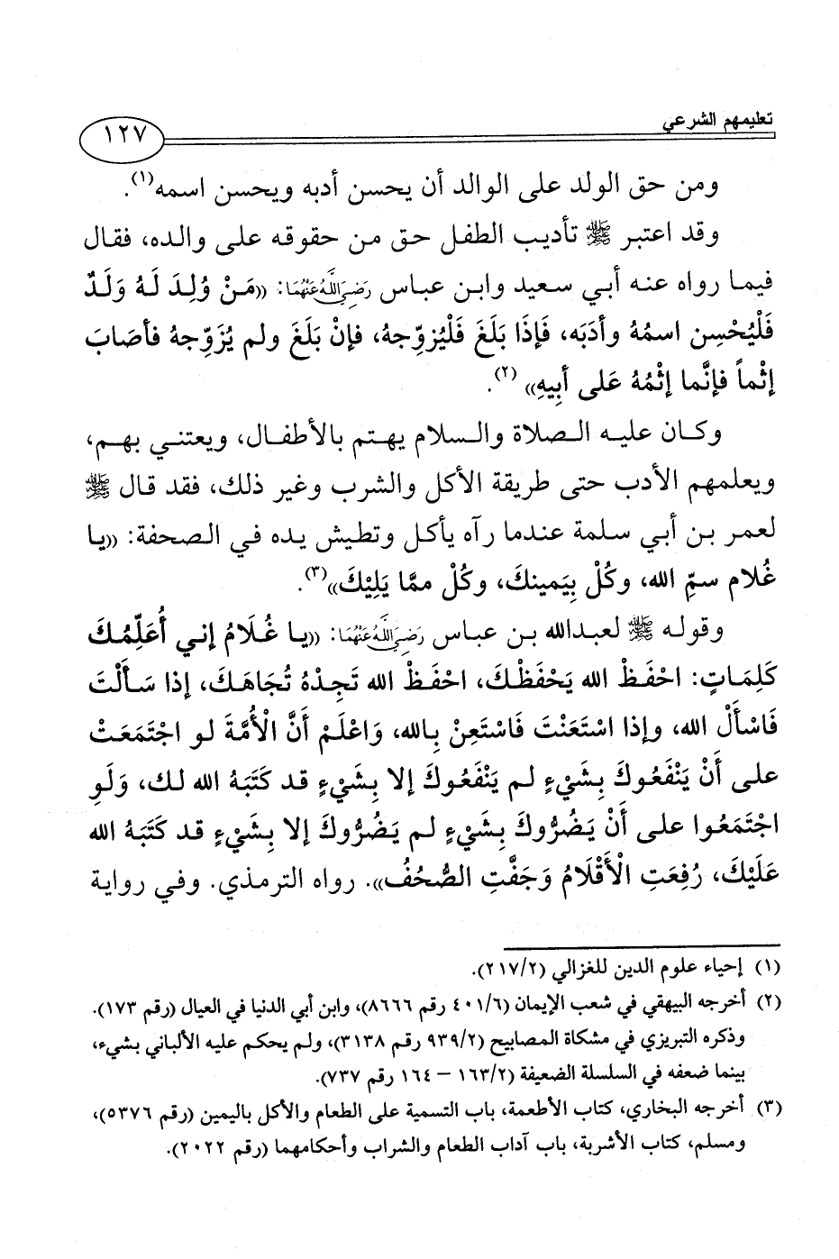 وقد اعتبر - صلى الله عليه وسلم - تأديب الطفل حق من حقوقه على والده، فقال فيما رواه عنه أبي سعيد وابن عباس رَضِيَ اللَّهُ عَنْهُمَا: ((مَنْ وُلِدَ لَهُ وَلَدٌ فَلْيُحْسِن اسمُهُ وأدَبَه، فَإذَا بَلَغَ فَلْيُزوِّجهُ، فإنْ بَلَغَ ولم يُزَوِّجهُ فأصَابَ إثْماً فإنَّما إثْمُهُ عَلى أبِيهِ)) (¬2).