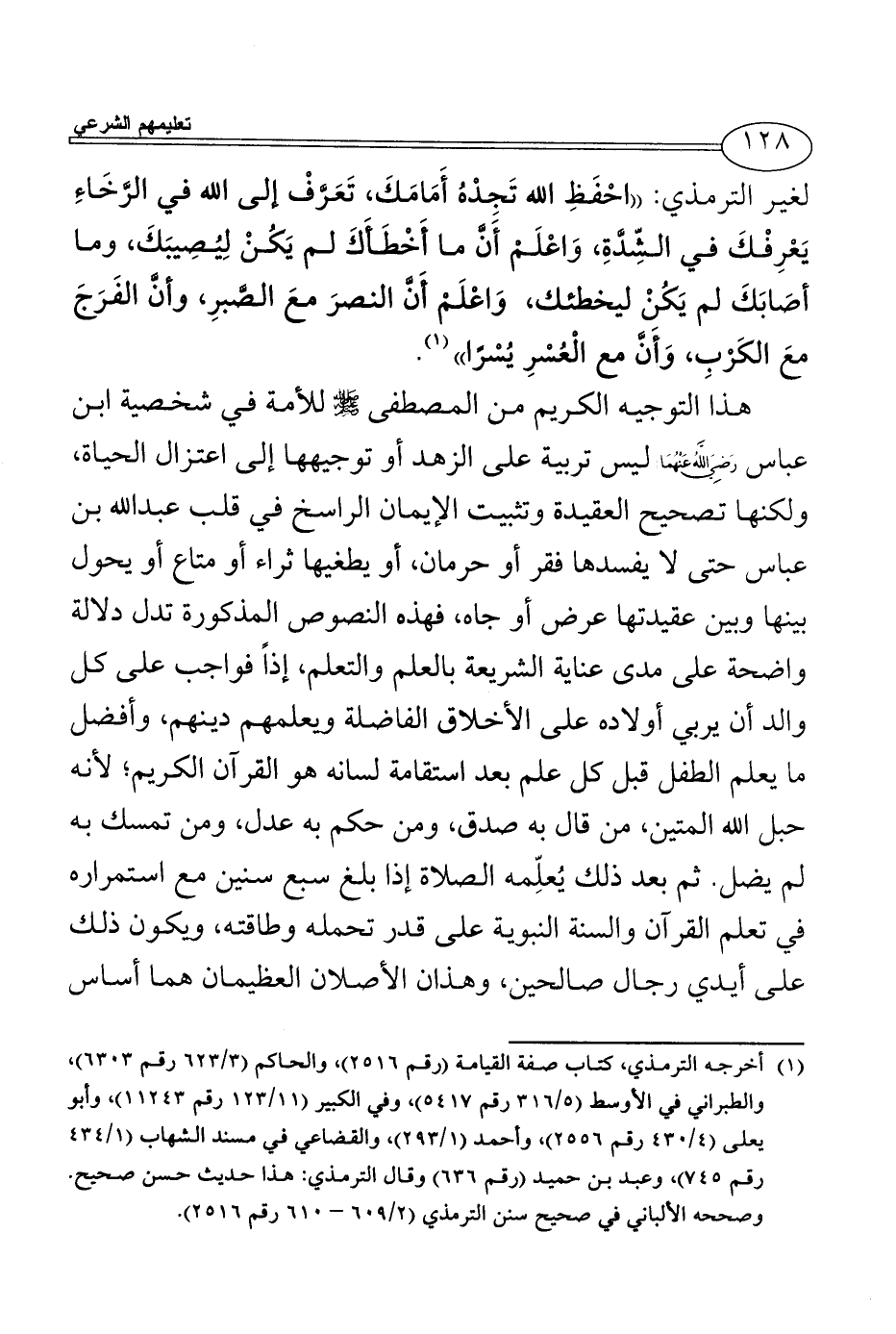 هذا التوجيه الكريم من المصطفى - صلى الله عليه وسلم - للأمة في شخصية ابن عباس رَضِيَ اللَّهُ عَنْهُمَا ليس تربية على الزهد أو توجيهها إلى اعتزال الحياة، ولكنها تصحيح العقيدة وتثبيت الإيمان الراسخ في قلب عبد الله بن عباس حتى لا يفسدها فقر أو حرمان، أو يطغيها ثراء أو متاع أو يحول بينها وبين عقيدتها عرض أو جاه، فهذه النصوص المذكورة تدل دلالة واضحة على مدى عناية الشريعة بالعلم والتعلم، إذاً فواجب على كل والد أن يربي أولاده على الأخلاق الفاضلة ويعلمهم دينهم، وأفضل ما يعلم الطفل قبل كل علم بعد استقامة لسانه هو القرآن الكريم؛ لأنه حبل الله المتين، من قال به صدق، ومن حكم به عدل، ومن تمسك به لم يضل. ثم بعد ذلك يُعلِّمه الصلاة إذا بلغ سبع سنين مع استمراره في تعلم القرآن والسنة النبوية على قدر تحمله وطاقته، ويكون ذلك على أيدي رجال صالحين، وهذان الأصلان العظيمان هما أساس