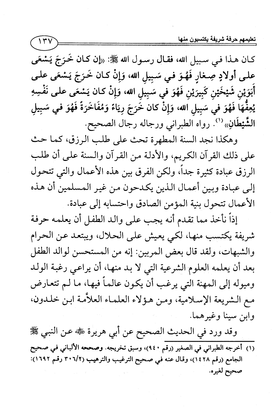 كان هذا في سبيل الله، فقال رسول الله - صلى الله عليه وسلم -: ((إن كان خَرَجَ يَسْعَى على أولادٍ صِغارٍ فَهُوَ في سَبِيلِ الله، وَإِنْ كان خَرَجَ يَسْعَى على أَبَوَيْنِ شَيْخَيْنِ كَبِيرَيْنِ فَهُوَ في سَبِيلِ الله، وَإِنْ كان يَسْعَى على نَفْسِهِ يُعِفُّهَا فَهُوَ في سَبِيلِ الله، وَإِنْ كان خَرَجَ رِيَاءً وَمُفَاخَرَةً فَهُوَ في سَبِيلِ الشَّيْطَانِ)) (¬1). رواه الطبراني ورجاله رجال الصحيح.