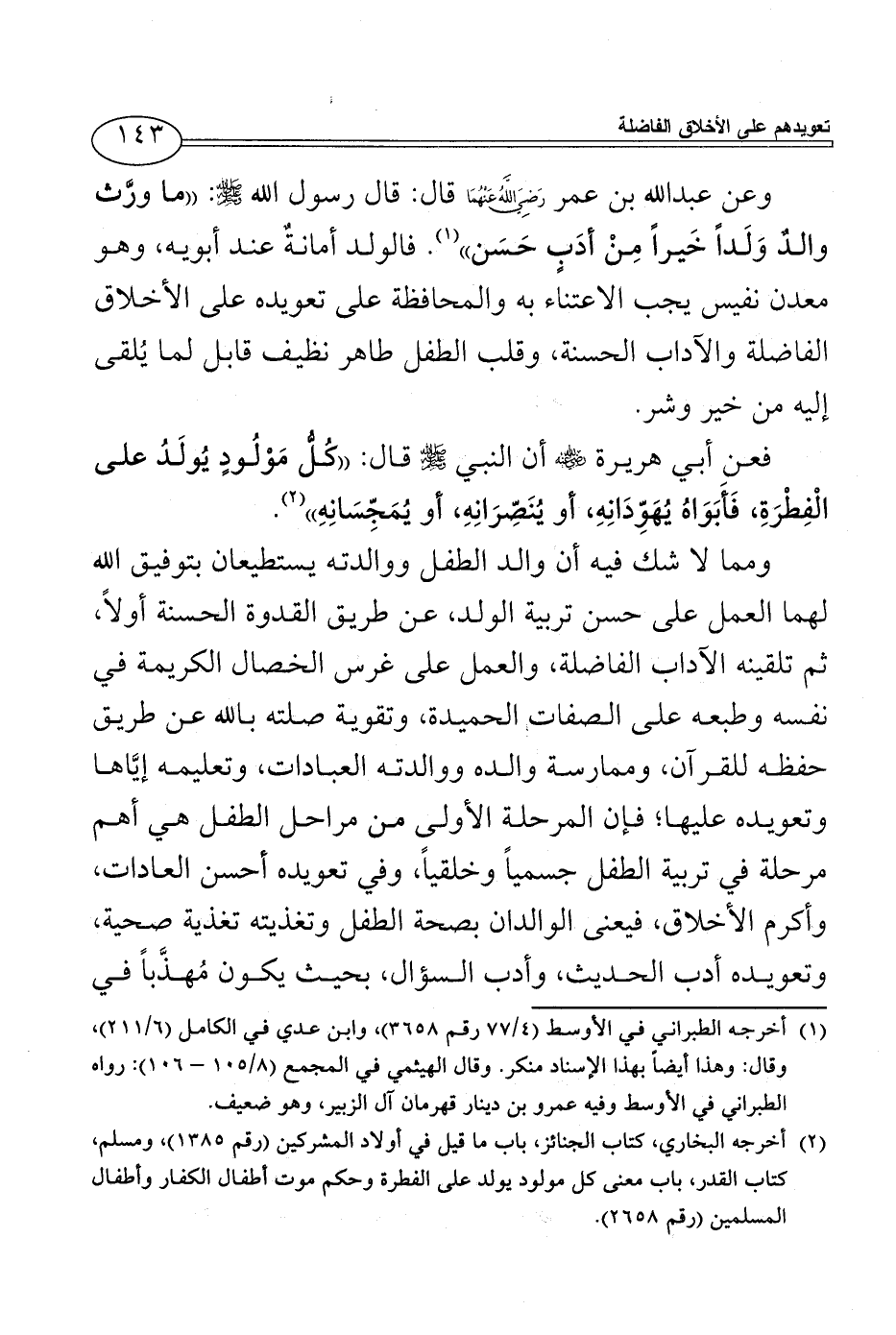 وعن عبد الله بن عمر رَضِيَ اللَّهُ عَنْهُمَا قال: قال رسول الله - صلى الله عليه وسلم -: ((ما ورَّث والدٌ وَلَداً خَيراً مِنْ أدَبٍ حَسَن)) (¬1). فالولد أمانةٌ عند أبويه، وهو معدن نفيس يجب الاعتناء به والمحافظة على تعويده على الأخلاق الفاضلة والآداب الحسنة، وقلب الطفل طاهر نظيف قابل لما يُلقى إليه من خير وشر.