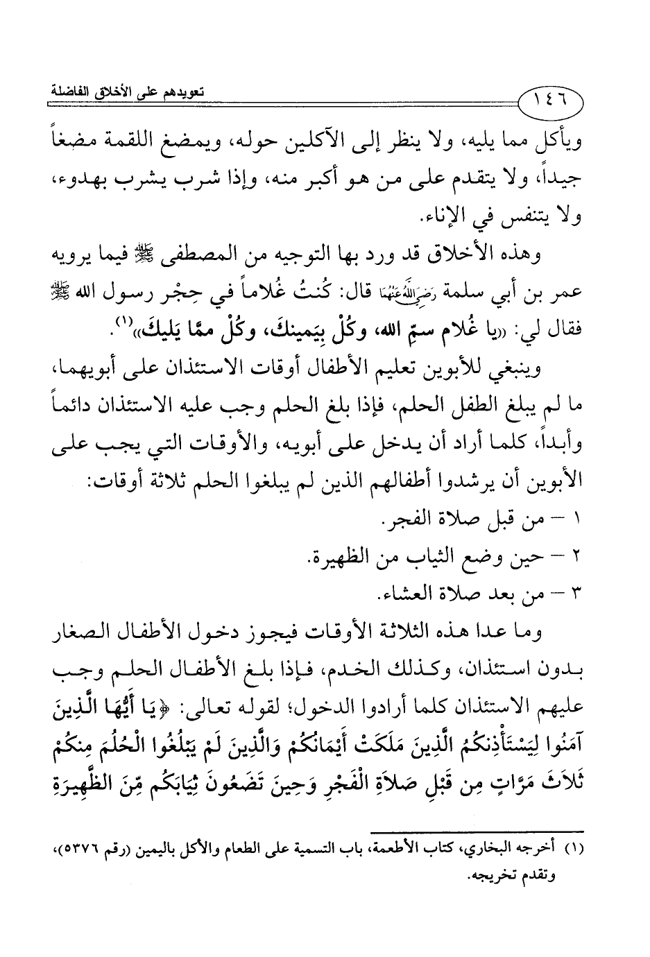 وهذه الأخلاق قد ورد بها التوجيه من المصطفى - صلى الله عليه وسلم - فيما يرويه عمر بن أبي سلمة رَضِيَ اللَّهُ عَنْهُمَا قال: كُنتُ غُلاماً في حِجْر رسول الله - صلى الله عليه وسلم - فقال لي: ((يا غُلام سمِّ الله، وكُلْ بِيَمينكَ، وكُلْ ممَّا يَليكَ)) (¬1).