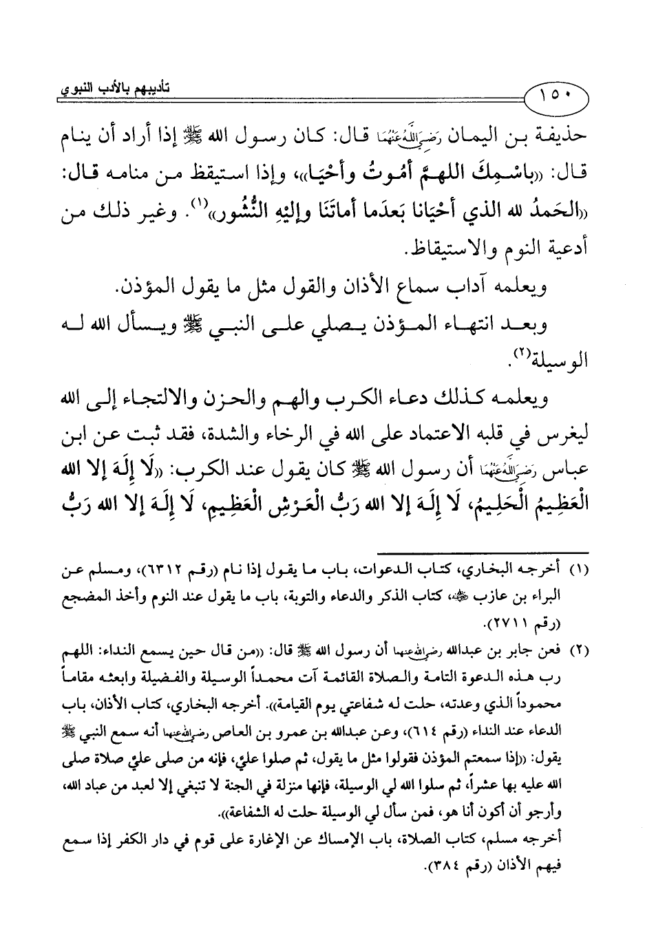 ويعلمه كذلك دعاء الكرب والهم والحزن والالتجاء إلى الله ليغرس في قلبه الاعتماد على الله في الرخاء والشدة، فقد ثبت عن ابن عباس رَضِيَ اللَّهُ عَنْهُمَا أن رسول الله - صلى الله عليه وسلم - كان يقول عند الكرب: ((لَا إِلَهَ إلا الله الْعَظِيمُ الْحَلِيمُ، لَا إِلَهَ إلا الله رَبُّ الْعَرْشِ الْعَظِيمِ، لَا إِلَهَ إلا الله رَبُّ