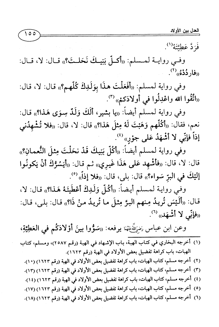 (¬6) أخرجه مسلم، كتاب الهبات، باب كراهة تفضيل بعض الأولاد في الهبة (رقم 1623) (18).