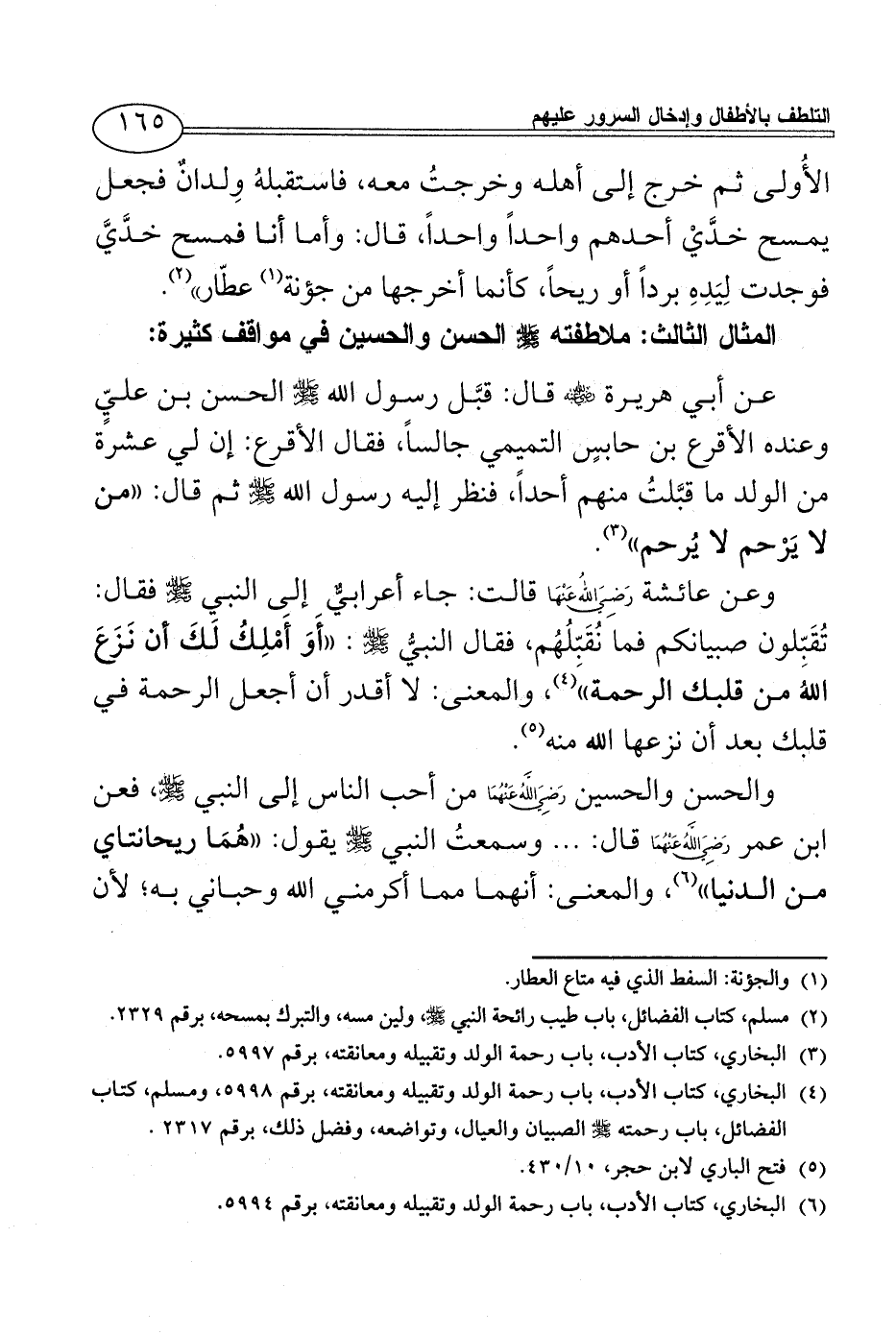 (¬4) البخاري، كتاب الأدب، باب رحمة الولد وتقبيله ومعانقته، برقم 5998، ومسلم، كتاب الفضائل، باب رحمته - صلى الله عليه وسلم - الصبيان والعيال، وتواضعه، وفضل ذلك، برقم 2317.