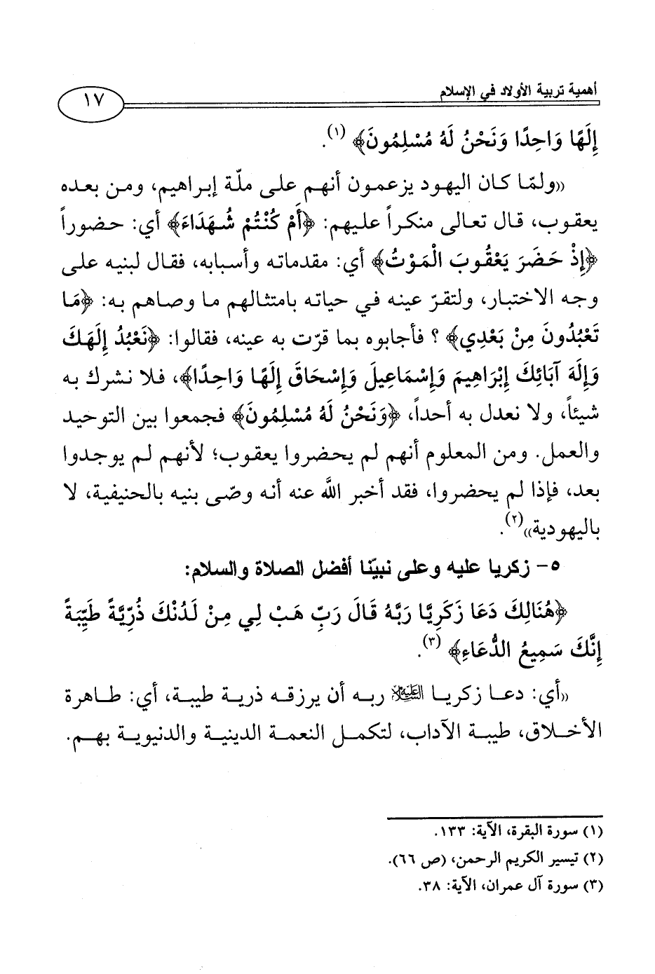 ((ولمّا كان اليهود يزعمون أنهم على ملّة إبراهيم، ومن بعده يعقوب، قال تعالى منكراً عليهم: (أَمْ كُنْتُمْ شُهَدَاءَ) أي: حضوراً (إِذْ حَضَرَ يَعْقُوبَ الْمَوْتُ) أي: مقدماته وأسبابه، فقال لبنيه على وجه الاختبار، ولتقرّ عينه في حياته بامتثالهم ما وصاهم به: (مَا تَعْبُدُونَ مِنْ بَعْدِي)؟ فأجابوه بما قرّت به عينه، فقالوا: (نَعْبُدُ إِلَهَكَ وَإِلَهَ آبَائِكَ إِبْرَاهِيمَ وَإِسْمَاعِيلَ وَإِسْحَاقَ إِلَهًا وَاحِدًا)، فلا نشرك به شيئاً، ولا نعدل به أحداً، (وَنَحْنُ لَهُ مُسْلِمُونَ) فجمعوا بين التوحيد والعمل. ومن المعلوم أنهم لم يحضروا يعقوب؛ لأنهم لم يوجدوا بعد، فإذا لم يحضروا، فقد أخبر اللَّه عنه أنه وصّى بنيه بالحنيفية، لا باليهودية)) (¬2).
