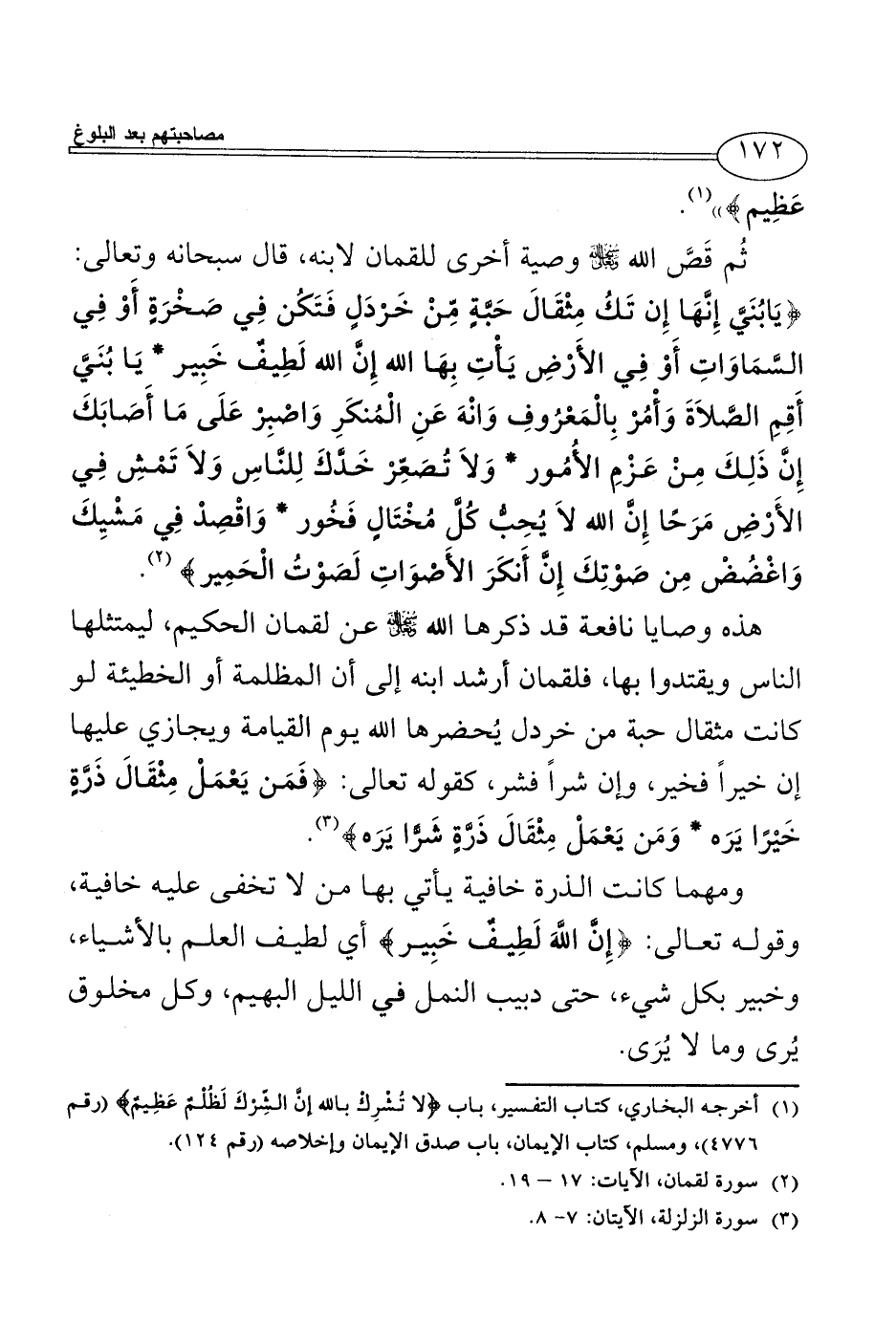 ثُم قَصَّ الله - سبحانه وتعالى - وصية أخرى للقمان لابنه، قال سبحانه وتعالى: {يَابُنَيَّ إِنَّهَا إِن تَكُ مِثْقَالَ حَبَّةٍ مِّنْ خَرْدَلٍ فَتَكُن فِي صَخْرَةٍ أَوْ فِي السَّمَاوَاتِ أَوْ فِي الأَرْضِ يَأْتِ بِهَا الله إِنَّ الله لَطِيفٌ خَبِير * يَا بُنَيَّ أَقِمِ الصَّلاَةَ وَأْمُرْ بِالْمَعْرُوفِ وَانْهَ عَنِ الْمُنكَرِ وَاصْبِرْ عَلَى مَا أَصَابَكَ إِنَّ ذَلِكَ مِنْ عَزْمِ الأُمُور * وَلاَ تُصَعِّرْ خَدَّكَ لِلنَّاسِ وَلاَ تَمْشِ فِي الأَرْضِ مَرَحًا إِنَّ الله لاَ يُحِبُّ كُلَّ مُخْتَالٍ فَخُور * وَاقْصِدْ فِي مَشْيِكَ وَاغْضُضْ مِن صَوْتِكَ إِنَّ أَنكَرَ الأَصْوَاتِ لَصَوْتُ الْحَمِير} (¬2).