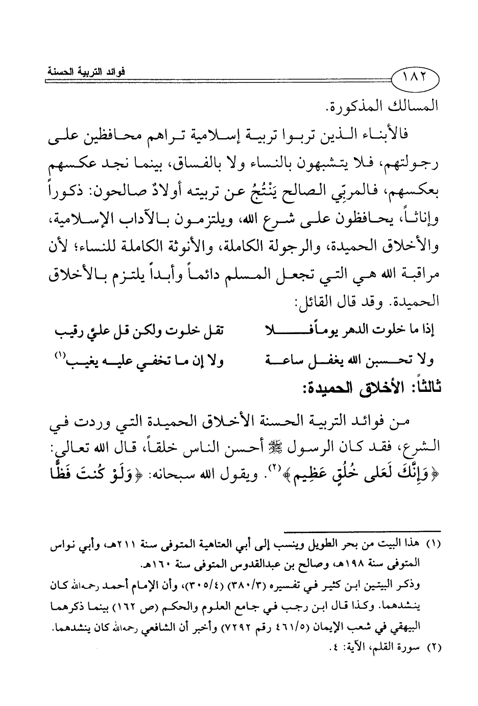 من فوائد التربية الحسنة الأخلاق الحميدة التي وردت في الشرع، فقد كان الرسول - صلى الله عليه وسلم - أحسن الناس خلقاً، قال الله تعالى: {وَإِنَّكَ لَعَلى خُلُقٍ عَظِيم} (¬2). ويقول الله سبحانه: {وَلَوْ كُنتَ فَظًّا