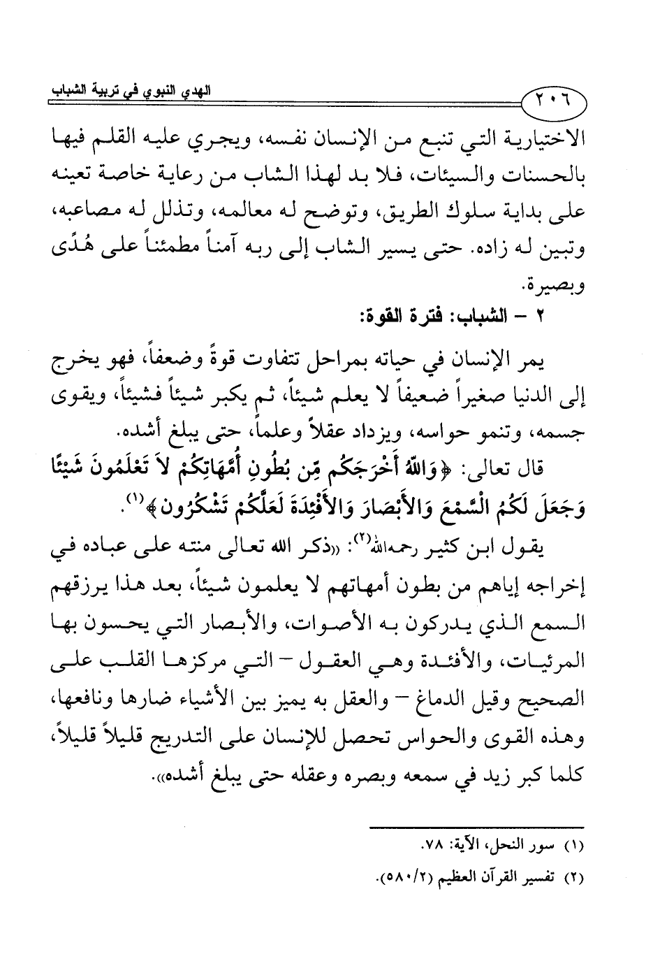 الاختيارية التي تنبع من الإنسان نفسه، ويجري عليه القلم فيها بالحسنات والسيئات، فلا بد لهذا الشاب من رعاية خاصة تعينه على بداية سلوك الطريق، وتوضح له معالمه، وتذلل له مصاعبه، وتبين له زاده. حتى يسير الشاب إلى ربه آمناً مطمئناً على هُدًى وبصيرة.