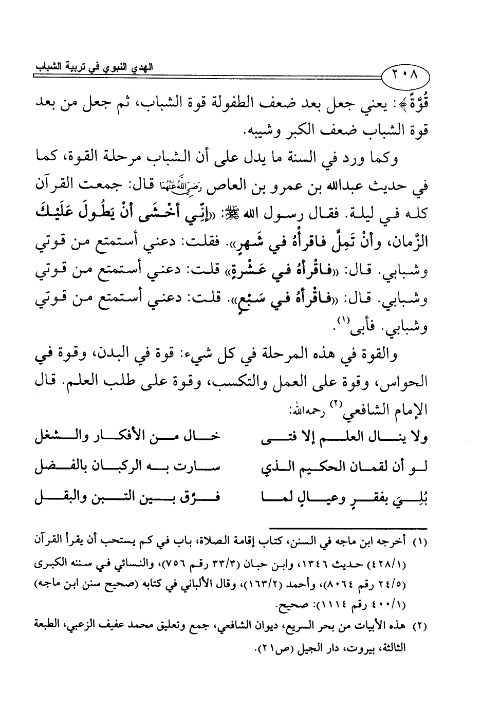 والقوة في هذه المرحلة في كل شيء: قوة في البدن، وقوة في الحواس، وقوة على العمل والتكسب، وقوة على طلب العلم. قال الإمام الشافعي (¬2) رحمه الله: