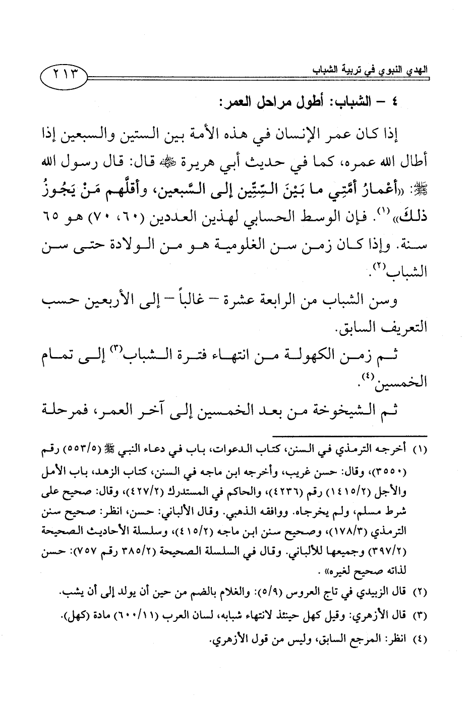إذا كان عمر الإنسان في هذه الأمة بين الستين والسبعين إذا أطال الله عمره، كما في حديث أبي هريرة - رضي الله عنه - قال: قال رسول الله - صلى الله عليه وسلم -: ((أعْمارُ أمَّتِي ما بَيْنَ السِّتِّين إلى السَّبعين، وأقلَّهم مَنْ يَجُوزُ ذلكَ)) (¬1). فإن الوسط الحسابي لهذين العددين (60، 70) هو 65 سنة. وإذا كان زمن سن الغلومية هو من الولادة حتى سن الشباب (¬2).