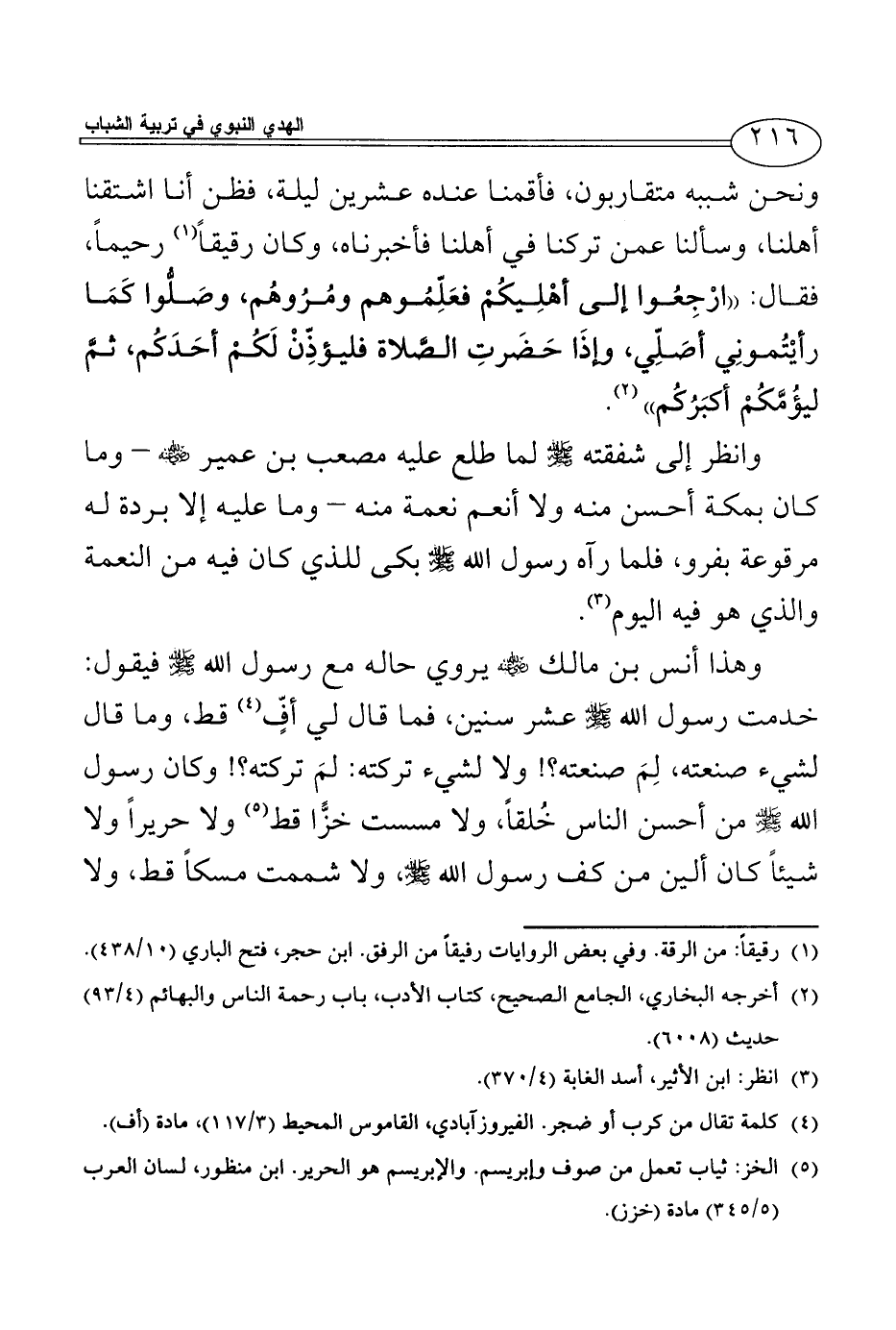 وهذا أنس بن مالك - رضي الله عنه - يروي حاله مع رسول الله - صلى الله عليه وسلم - فيقول: خدمت رسول الله - صلى الله عليه وسلم - عشر سنين، فما قال لي أفٍّ (¬4) قط، وما قال لشيء صنعته، لِمَ صنعته؟! ولا لشيء تركته: لمَ تركته؟! وكان رسول الله - صلى الله عليه وسلم - من أحسن الناس خُلقاً، ولا مسست خزًّا قط (¬5) ولا حريراً ولا شيئاً كان ألين من كف رسول الله - صلى الله عليه وسلم -، ولا شممت مسكاً قط، ولا