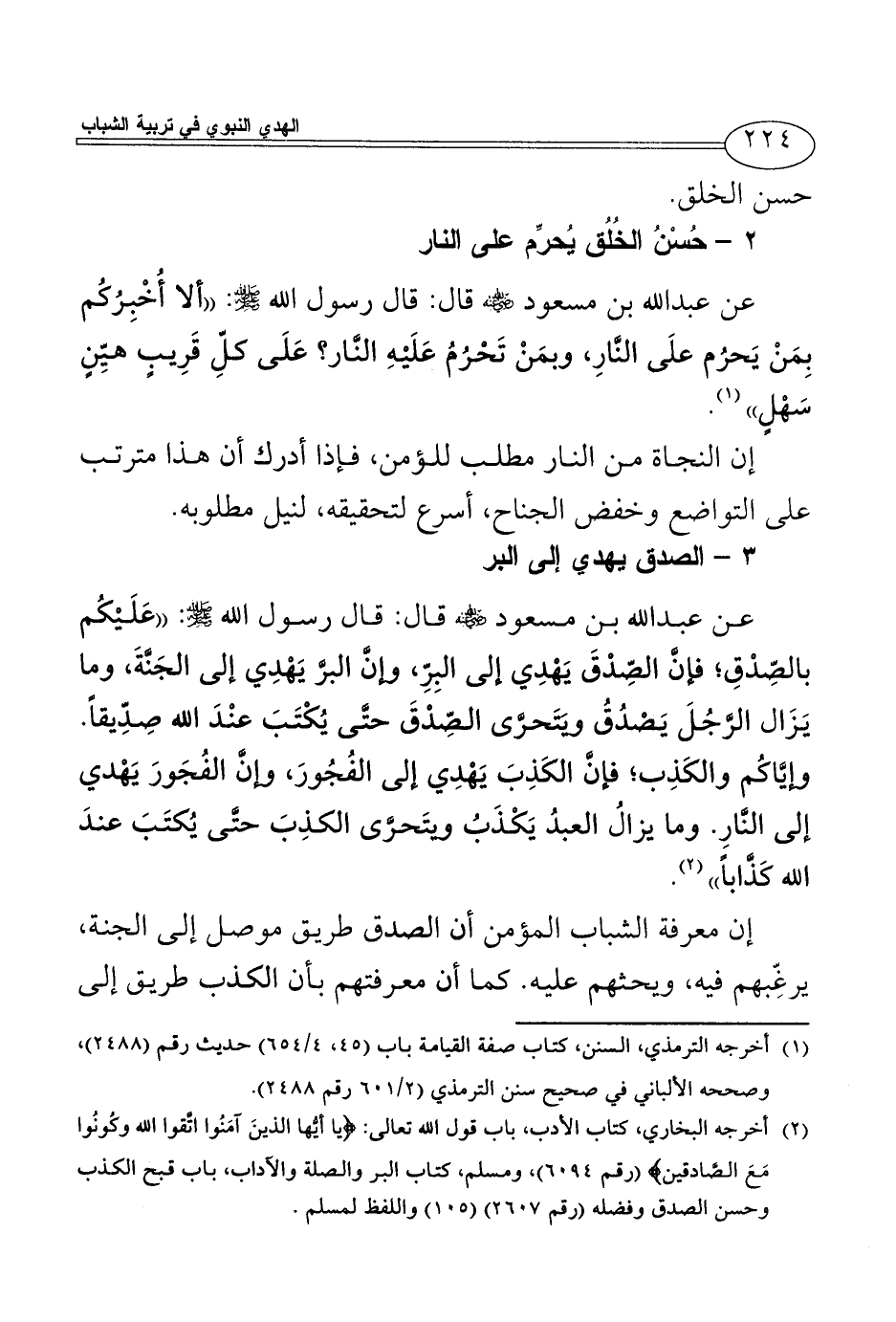 عن عبد الله بن مسعود - رضي الله عنه - قال: قال رسول الله - صلى الله عليه وسلم -: ((عَلَيْكُم بالصِّدْقِ؛ فإنَّ الصِّدْقَ يَهْدِي إلى البِرِّ، وإنَّ البرَّ يَهْدِي إلى الجَنَّةَ، وما يَزَال الرَّجُلَ يَصْدُقُ ويَتَحرَّى الصِّدْقَ حتَّى يُكْتَبَ عنْدَ الله صِدِّيقاً. وإيَّاكُم والكَذِب؛ فإنَّ الكَذِبَ يَهْدِي إلى الفُجُورَ، وإنَّ الفُجَورَ يَهْدي إلى النَّارِ. وما يزالُ العبدُ يَكْذَبُ ويتَحرَّى الكذِبَ حتَّى يُكتَبَ عندَ الله كَذَّاباً)) (¬2).