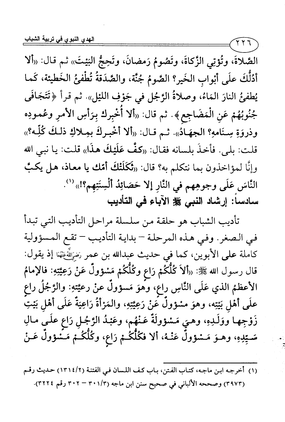 الصَّلاةَ، وتُؤتِي الزَّكاةَ، وتَصُومُ رَمضانَ، وتَحِجُّ البَيْتَ)) ثم قال: ((ألا أدُلُّكَ علَى أبْوابِ الخَير؟ الصَّومُ جُنَّة، والصَّدَقةُ تُطْفئُ الخَطيئة، كَما يُطفئُ النارَ المَاءُ، وصلاةُ الرَّجُل في جَوْفِ الليْل)). ثم قرأ {تَتَجَافَى جُنُوبُهُمْ عَنِ الْمَضَاجِعِ}. ثم قال: ((ألا أُخْبِرك بِرَأسِ الأمرِ وعُمودِه وذروَةِ سِنَامهِ؟ الجهَادُ)). ثم قال: ((ألا أخْبركَ بمِلاكِ ذلكَ كُلِّه؟)) قلت: بلى. فأخذَ بلسانه فقال: ((كفَّ عَلَيْكَ هذَا)) قلت: يا نبي الله وإنَّا لمؤاخذون بما نتكلم به؟ قال: ((ثَكَلَتْكَ أمّك يا معاذ، هل يكبَّ النَّاسَ عَلَى وجوهِهم في النَّارِ إلا حَصَائِدُ ألْسِنَتِهِم؟!)) (¬1).