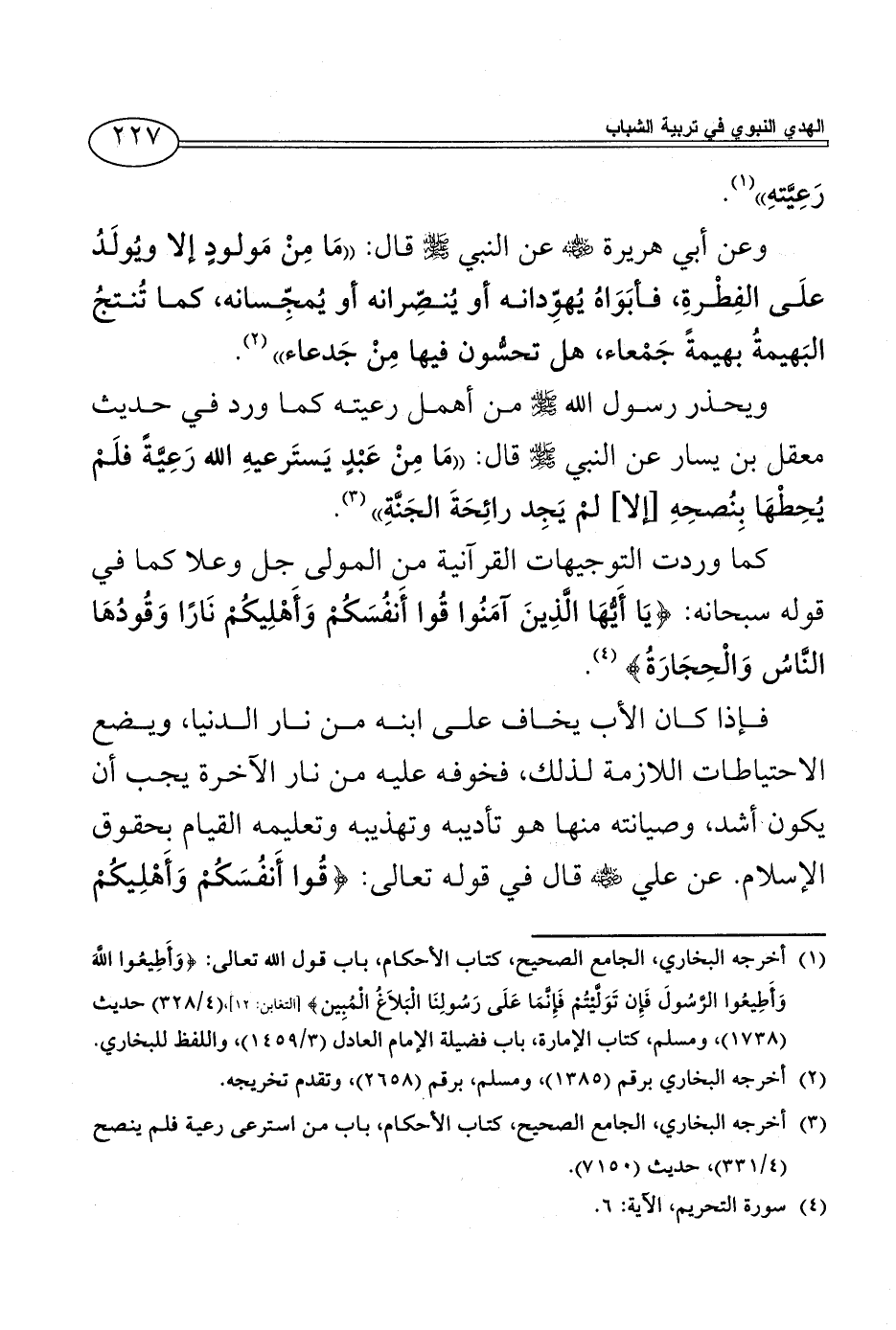 كما وردت التوجيهات القرآنية من المولى جل وعلا كما في قوله سبحانه: {يَا أَيُّهَا الَّذِينَ آمَنُوا قُوا أَنفُسَكُمْ وَأَهْلِيكُمْ نَارًا وَقُودُهَا النَّاسُ وَالْحِجَارَةُ} (¬4).