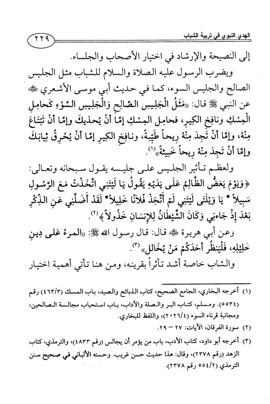 وعن أبي هريرة - رضي الله عنه - قال: قال رسول الله - صلى الله عليه وسلم -: ((المرءُ عَلى دِينِ خَلِيْلِهِ، فَلْيَنظُر أحَدَكُمْ مَنْ يُخَالل)) (¬3).