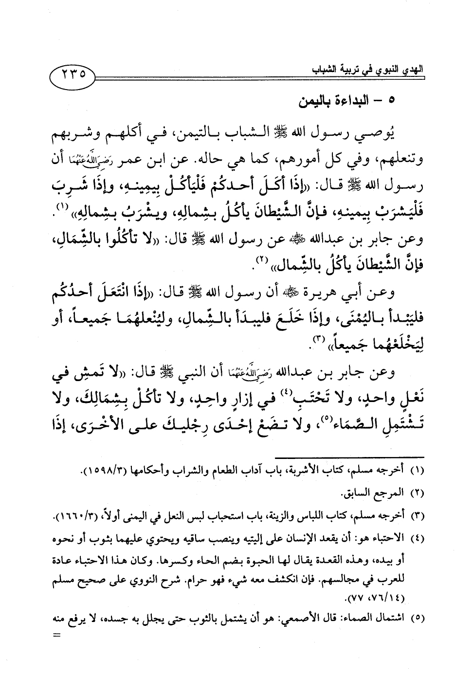 يُوصي رسول الله - صلى الله عليه وسلم - الشباب بالتيمن، في أكلهم وشربهم وتنعلهم، وفي كل أمورهم، كما هي حاله. عن ابن عمر رَضِيَ اللَّهُ عَنْهُمَا أن رسول الله - صلى الله عليه وسلم - قال: ((إذَا أكَلَ أحدكُمْ فَلْيَأكُلْ بِيمِينهِ، وإذَا شَرِبَ فَلْيَشرَبْ بِيمينهِ، فإنَّ الشَّيْطانَ يأكُلُ بشِمالِهِ، ويشْرَبُ بشِمالِهِ)) (¬1). وعن جابر بن عبد الله - رضي الله عنه - عن رسول الله - صلى الله عليه وسلم - قال: ((لا تأكُلُوا بالشِّمَالِ، فإنَّ الشَّيْطانَ يأكُلُ بالشِّمال)) (¬2).