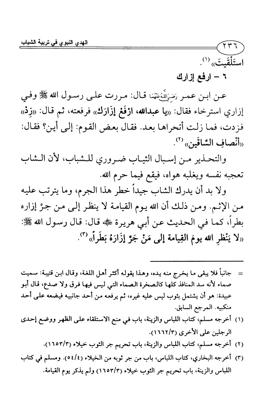 ولا بد أن يدرك الشاب جيداً خطر هذا الجرم، وما يترتب عليه من الإثم. ومن ذلك أن الله يوم القيامة لا ينظر إلى من جرَّ إزاره بطراً، كما في الحديث عن أبي هريرة - رضي الله عنه - قال: قال رسول الله - صلى الله عليه وسلم -: ((لا يَنْظرِ الله يومَ القِيامة إلى مَنْ جَرَّ إزَارَهُ بَطَراً)) (¬3).