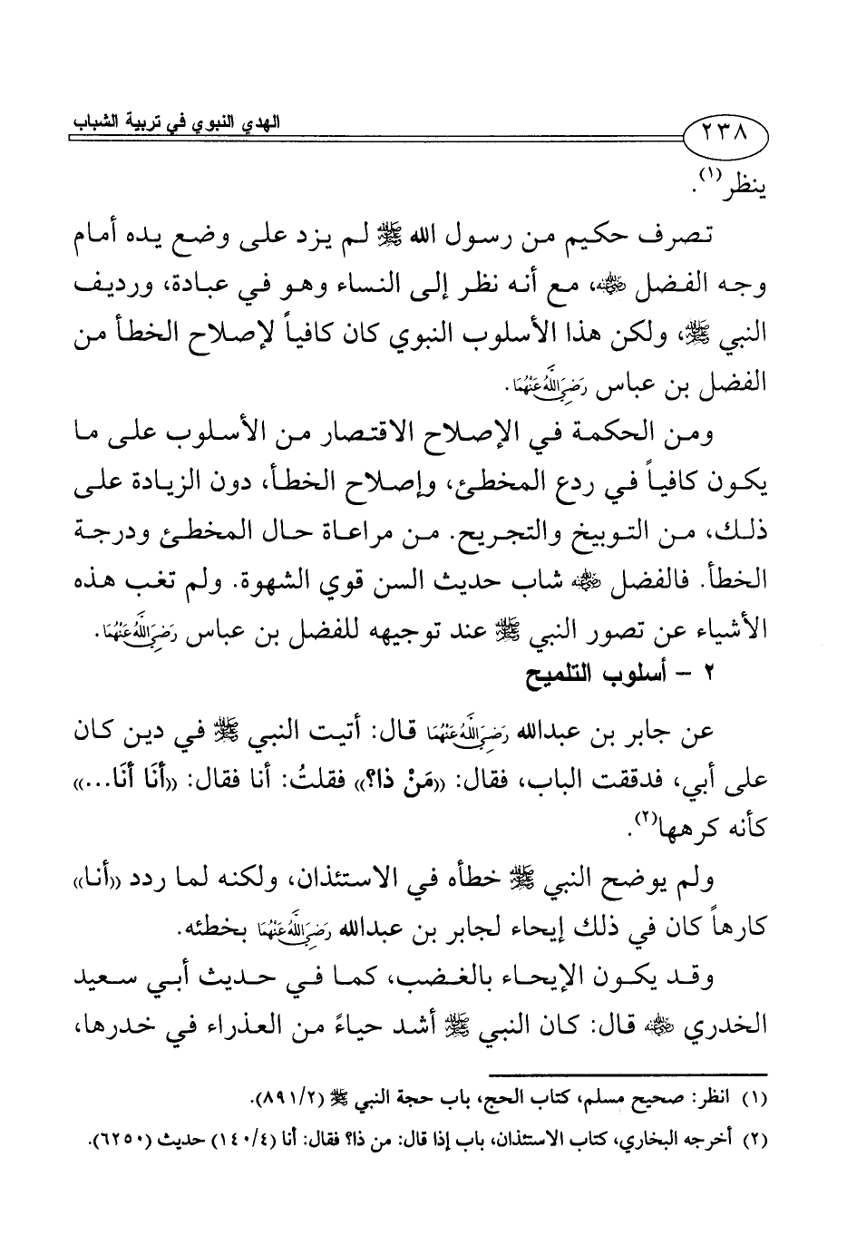 ومن الحكمة في الإصلاح الاقتصار من الأسلوب على ما يكون كافياً في ردع المخطئ، وإصلاح الخطأ، دون الزيادة على ذلك، من التوبيخ والتجريح. من مراعاة حال المخطئ ودرجة الخطأ. فالفضل - رضي الله عنه - شاب حديث السن قوي الشهوة. ولم تغب هذه الأشياء عن تصور النبي - صلى الله عليه وسلم - عند توجيهه للفضل بن عباس رَضِيَ اللَّهُ عَنْهُمَا.