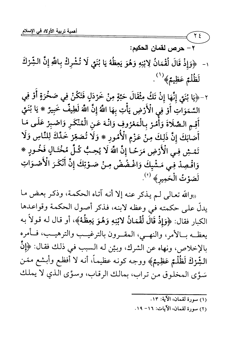 1 - (وَإِذْ قَالَ لُقْمَانُ لِابْنِهِ وَهُوَ يَعِظُهُ يَا بُنَيَّ لَا تُشْرِكْ بِاللَّهِ إِنَّ الشِّرْكَ لَظُلْمٌ عَظِيمٌ) (¬1).