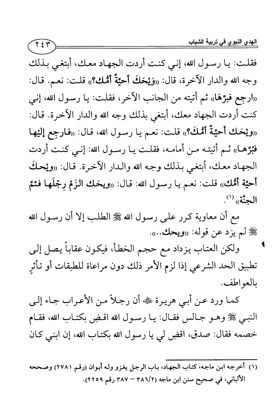 فقلت: يا رسول الله، إني كنت أردت الجهاد معك، أبتغي بذلك وجه الله والدار الآخرة، قال: ((وَيْحَكَ أحيَّةٌ أمُّك؟)) قلت: نعم. قال: ((ارجِع فبرَّهَا)) ثم أتيته من الجانب الآخر، فقلت: يا رسول الله، إني كنت أردت الجهاد معك، أبتغي بذلك وجه الله والدار الآخرة. قال: ((ويْحَك أحيَّةٌ أمُّكَ؟)) قلت: نعم يا رسول الله، قال: ((فارجِع إليْها فبُرَّها)) ثم أتيته من أمامه، فقلت يا رسول الله: إني كنت أردت الجهاد معك، أبتغي بذلك وجه الله والدار الآخرة. قال: ((ويْحكَ أحيَّة أمُّك)) قلت: نعم يا رسول الله: قال: ((ويحَك الزَمْ رِجْلَها فثمَّ الجنَّة)) (¬1).