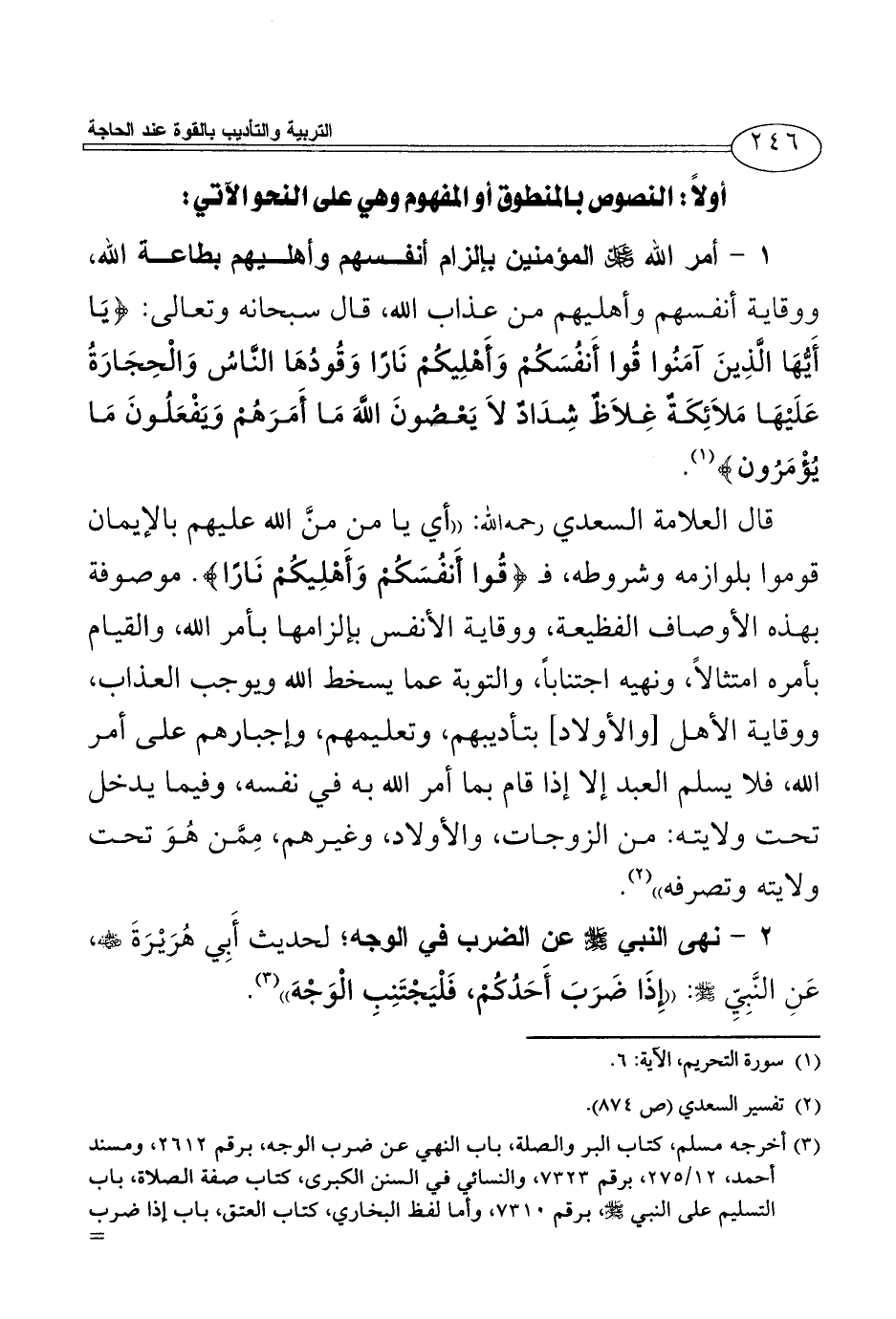 قال العلامة السعدي رحمه الله: ((أي يا من منَّ الله عليهم بالإيمان قوموا بلوازمه وشروطه، فـ {قُوا أَنفُسَكُمْ وَأَهْلِيكُمْ نَارًا}. موصوفة بهذه الأوصاف الفظيعة، ووقاية الأنفس بإلزامها بأمر الله، والقيام بأمره امتثالاً، ونهيه اجتناباً، والتوبة عما يسخط الله ويوجب العذاب، ووقاية الأهل [والأولاد] بتأديبهم، وتعليمهم، وإجبارهم على أمر الله، فلا يسلم العبد إلا إذا قام بما أمر الله به في نفسه، وفيما يدخل تحت ولايته: من الزوجات، والأولاد، وغيرهم، مِمَّن هُوَ تحت ولايته وتصرفه)) (¬2).
