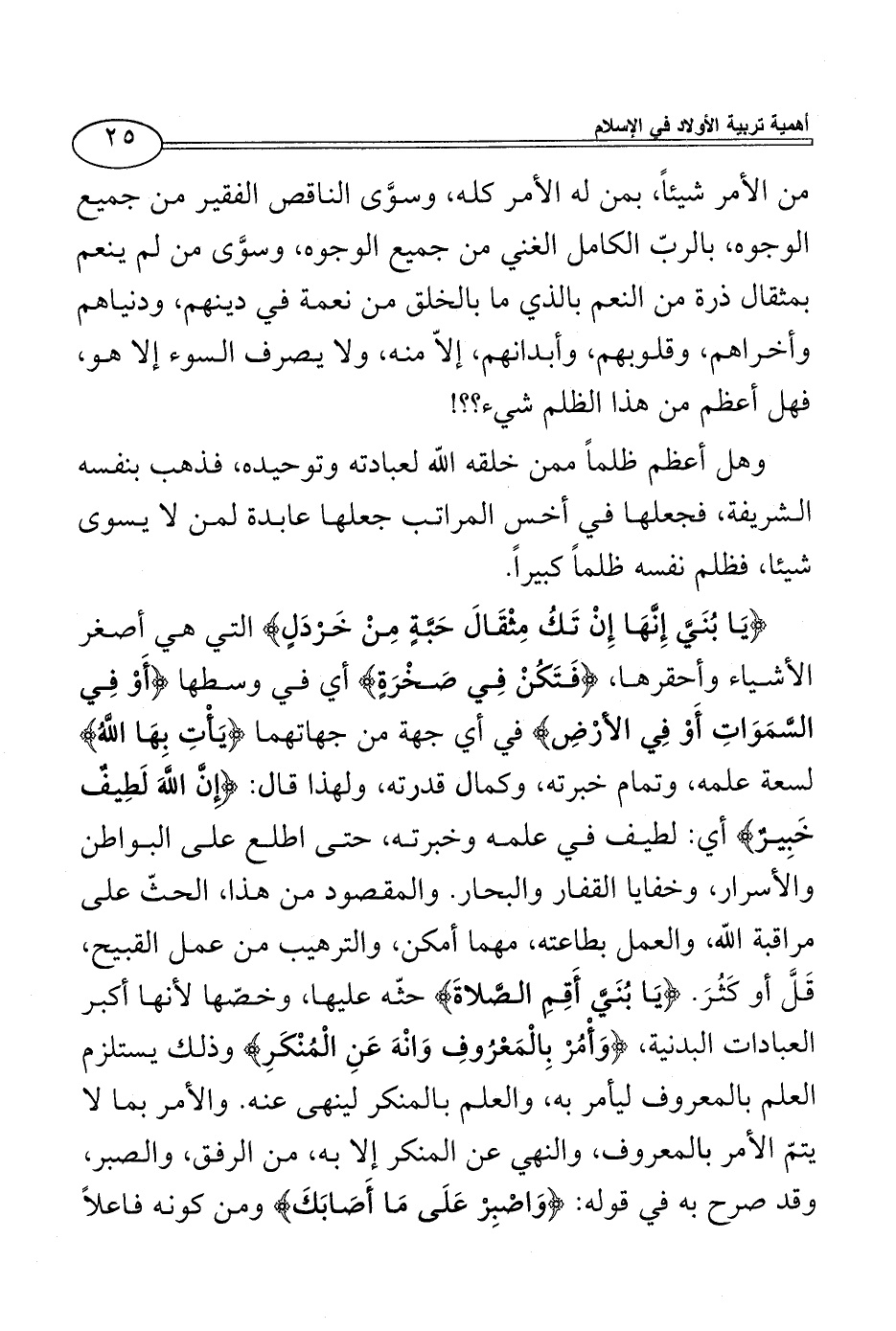 (يَا بُنَيَّ إِنَّهَا إِنْ تَكُ مِثْقَالَ حَبَّةٍ مِنْ خَرْدَلٍ) التي هي أصغر الأشياء وأحقرها، (فَتَكُنْ فِي صَخْرَةٍ) أي في وسطها (أَوْ فِي السَّمَوَاتِ أَوْ فِي الأرْضِ) في أي جهة من جهاتهما (يَأْتِ بِهَا اللَّهُ) لسعة علمه، وتمام خبرته، وكمال قدرته، ولهذا قال: (إِنَّ اللَّهَ لَطِيفٌ خَبِيرٌ) أي: لطيف في علمه وخبرته، حتى اطلع على البواطن والأسرار، وخفايا القفار والبحار. والمقصود من هذا، الحثّ على مراقبة الله، والعمل بطاعته، مهما أمكن، والترهيب من عمل القبيح، قَلَّ أو كَثُرَ. (يَا بُنَيَّ أَقِمِ الصَّلاةَ) حثّه عليها، وخصّها لأنها أكبر العبادات البدنية، (وَأْمُرْ بِالْمَعْرُوفِ وَانْهَ عَنِ الْمُنْكَرِ) وذلك يستلزم العلم بالمعروف ليأمر به، والعلم بالمنكر لينهى عنه. والأمر بما لا يتمّ الأمر بالمعروف، والنهي عن المنكر إلا به، من الرفق، والصبر، وقد صرح به في قوله: (وَاصْبِرْ عَلَى مَا أَصَابَكَ) ومن كونه فاعلاً