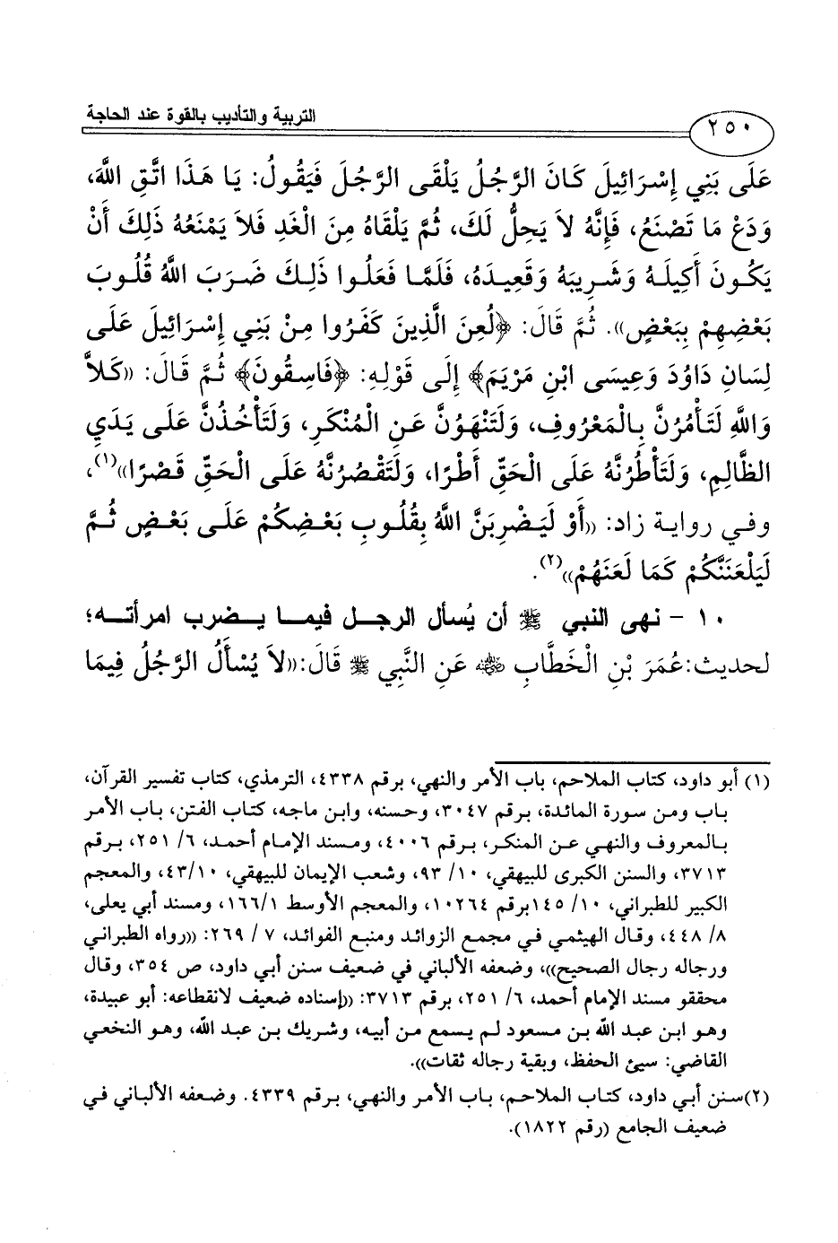 (¬2) سنن أبي داود، كتاب الملاحم، باب الأمر والنهي، برقم 4339. وضعفه الألباني في ضعيف الجامع (رقم 1822).