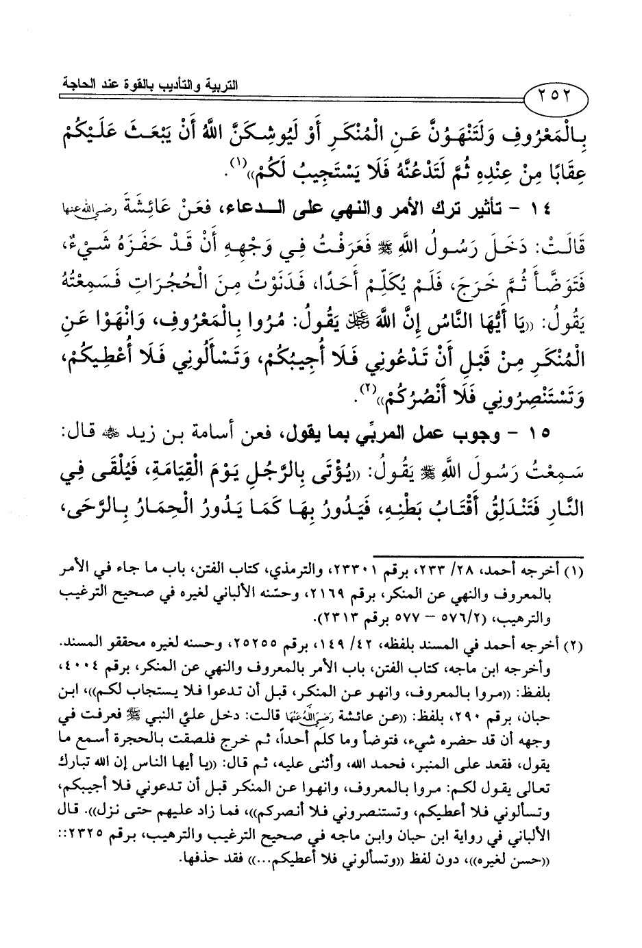 14 - تأثير ترك الأمر والنهي على الدعاء، فعَنْ عَائِشَةَ رضي الله عنها قَالَتْ: دَخَلَ رَسُولُ اللَّهِ - صلى الله عليه وسلم - فَعَرَفْتُ فِي وَجْهِهِ أَنْ قَدْ حَفَزَهُ شَيْءٌ، فَتَوَضَّأَ ثُمَّ خَرَجَ، فَلَمْ يُكَلِّمْ أَحَدًا، فَدَنَوْتُ مِنَ الْحُجُرَاتِ فَسَمِعْتُهُ يَقُولُ: ((يَا أَيُّهَا النَّاسُ إِنَّ اللَّهَ - عز وجل - يَقُولُ: مُرُوا بِالْمَعْرُوفِ، وَانْهَوْا عَنِ الْمُنْكَرِ مِنْ قَبْلِ أَنْ تَدْعُونِي فَلَا أُجِيبُكُمْ، وَتَسْأَلُونِي فَلَا أُعْطِيكُمْ، وَتَسْتَنْصِرُونِي فَلَا أَنْصُرُكُمْ)) (¬2).