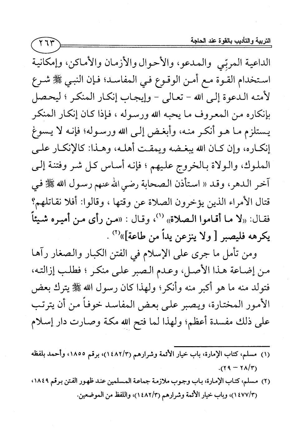 الداعية المربِّي والمدعو، والأحوال والأزمان والأماكن، وإمكانية استخدام القوة مع أمن الوقوع في المفاسد؛ فإن النبي - صلى الله عليه وسلم - شرع لأمته الدعوة إلى الله - تعالى - وإيجاب إنكار المنكر؛ ليحصل بإنكاره من المعروف ما يحبه الله ورسوله , فإذا كان إنكار المنكر يستلزم ما هو أنكر منه, وأبغض إلى الله ورسوله؛ فإنه لا يسوغ إنكاره, وإن كان الله يبغضه ويمقت أهله, وهذا: كالإنكار على الملوك، والولاة بالخروج عليهم؛ فإنه أساس كل شر وفتنة إلى آخر الدهر, وقد «استأذن الصحابة رضي الله عنهم رسول الله - صلى الله عليه وسلم - في قتال الأمراء الذين يؤخرون الصلاة عن وقتها , وقالوا: أفلا نقاتلهم؟ فقال: ((لا ما أقاموا الصلاة)) (¬1)، وقال: «من رأى من أميره شيئاً يكرهه فليصبر [ولا ينزعن يداً من طاعة]» (¬2).