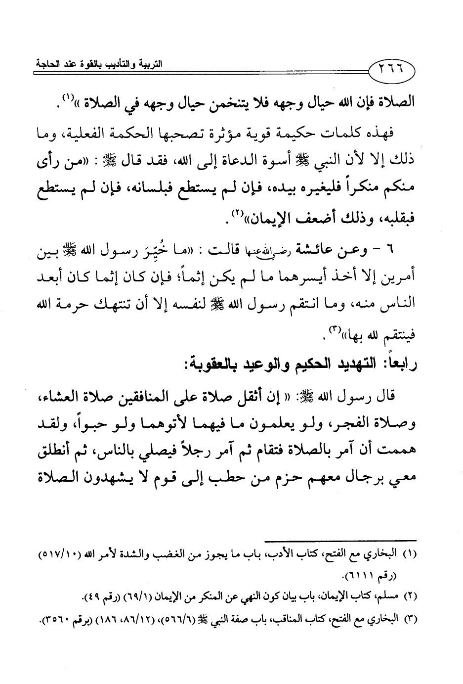 فهذه كلمات حكيمة قوية مؤثرة تصحبها الحكمة الفعلية، وما ذلك إلا لأن النبي - صلى الله عليه وسلم - أسوة الدعاة إلى الله، فقد قال - صلى الله عليه وسلم -: «من رأى منكم منكراً فليغيره بيده، فإن لم يستطع فبلسانه، فإن لم يستطع فبقلبه، وذلك أضعف الإيمان» (¬2).