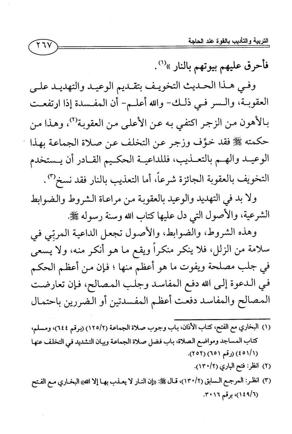 وفي هذا الحديث التخويف بتقديم الوعيد والتهديد على العقوبة، والسر في ذلك- والله أعلم- أن المفسدة إذا ارتفعت بالأهون من الزجر اكتفي به عن الأعلى من العقوبة (¬2)، وهذا من حكمته - صلى الله عليه وسلم - فقد خوَّف وزجر عن التخلف عن صلاة الجماعة بهذا الوعيد والهم بالتعذيب، فللداعية الحكيم القادر أن يستخدم التخويف بالعقوبة الجائزة شرعاً، أما التعذيب بالنار فقد نسخ (¬3).