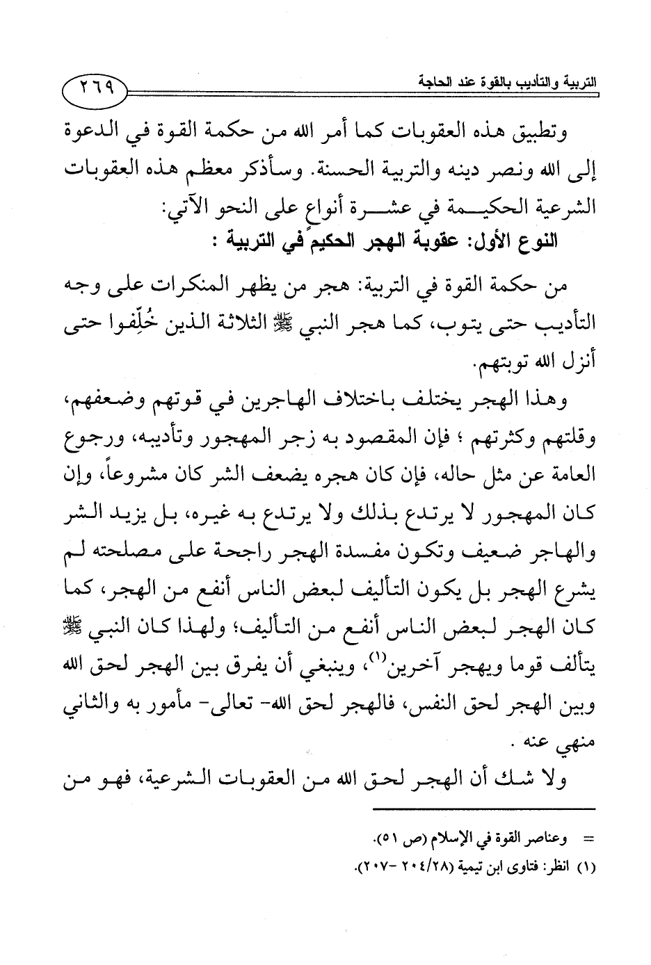 من حكمة القوة في التربية: هجر من يظهر المنكرات على وجه التأديب حتى يتوب، كما هجر النبي - صلى الله عليه وسلم - الثلاثة الذين خُلِّفوا حتى أنزل الله توبتهم.