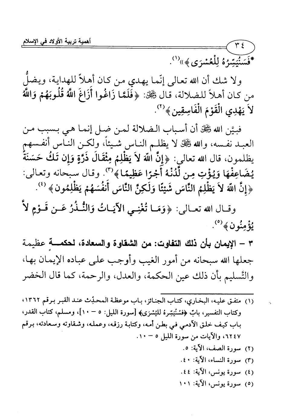 3 - الإيمان بأن ذلك التفاوت: من الشقاوة والسعادة، لحكمةٍ عظيمة جعلها الله سبحانه من أمور الغيب وأوجب على عباده الإيمان بها، والتَّسليم بأن ذلك عين الحكمة، والعدل، والرحمة، كما قال الخضر
