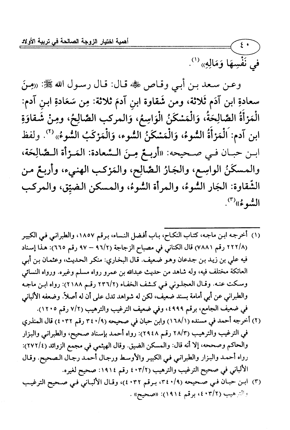 وعن سعد بن أبي وقاص - رضي الله عنه - قال: قال رسول الله - صلى الله عليه وسلم -: ((مِنَ سعادةِ ابن آدَم ثَلاثة، ومن شَقاوة ابنِ آدمَ ثلاثة: مِن سَعَادةِ ابنِ آدم: الْمَرْأَةُ الصَّالِحَةُ، وَالْمَسْكَنُ الْوَاسِعُ، وَالمركب الصَّالِحُ، ومِنْ شَقاوَةِ ابن آدم: َالْمَرْأَةُ السُّوءُ، وَالْمَسْكَنُ السُّوء، وَالْمَرْكَبُ السُّوءُ)) (¬2). ولفظ ابن حبان في صحيحه: «أربعٌ مِنَ السَّعادة: المَرْأة الصَّالِحَة، والمسكَنُ الواسِع، والجَارُ الصَّالِح، والمَرْكب الهنيء، وأربعٌ من الشّقاوة: الجَار السُّوءُ، والمرأة السُّوءُ، والمسكن الضيِّق، والمركب السُّوءُ» (¬3).